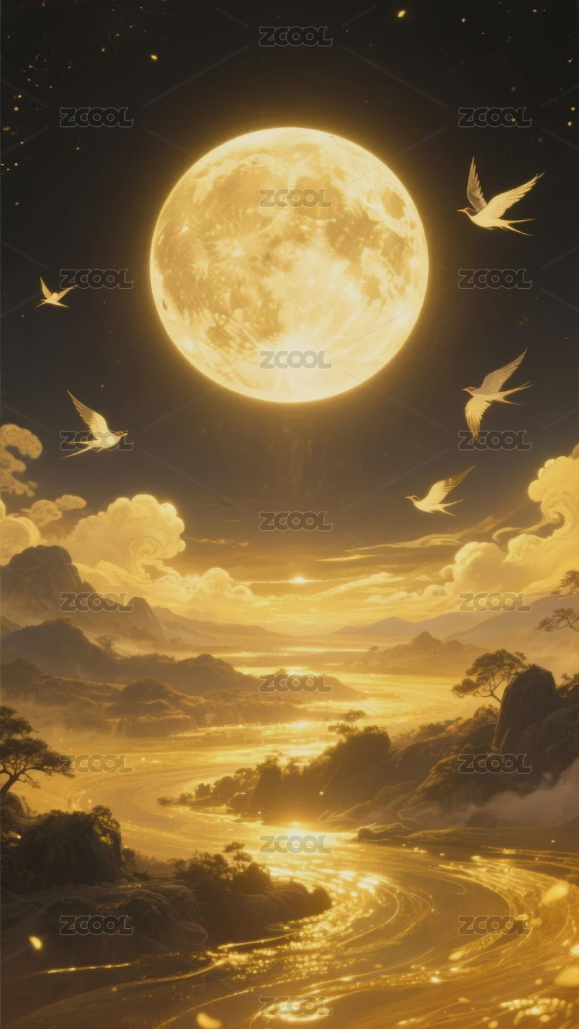 奇幻月夜下的山川与飞鸟