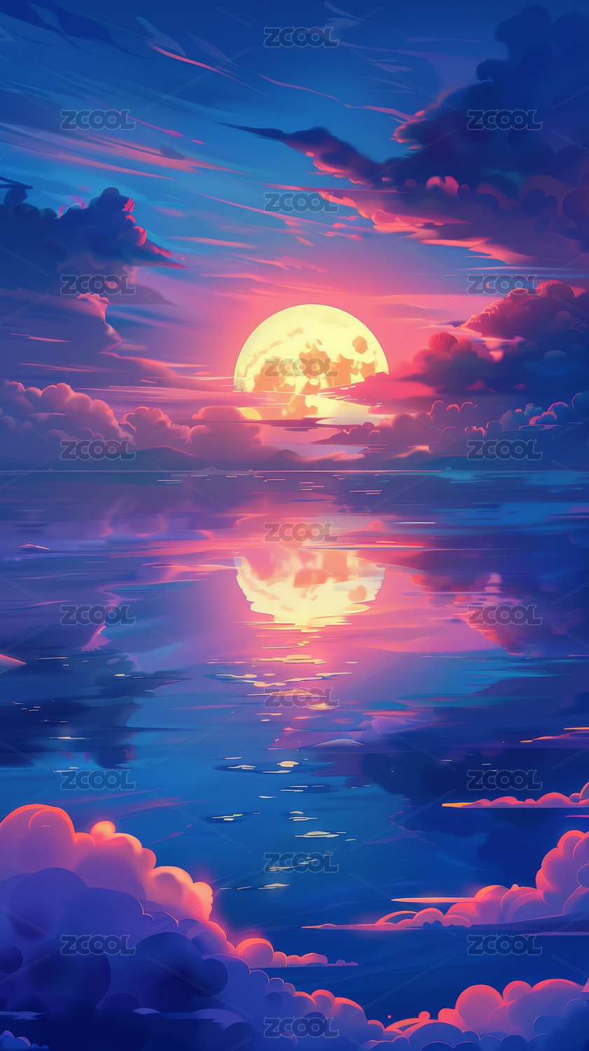 梦幻湖畔巨大月亮下的宁静景象