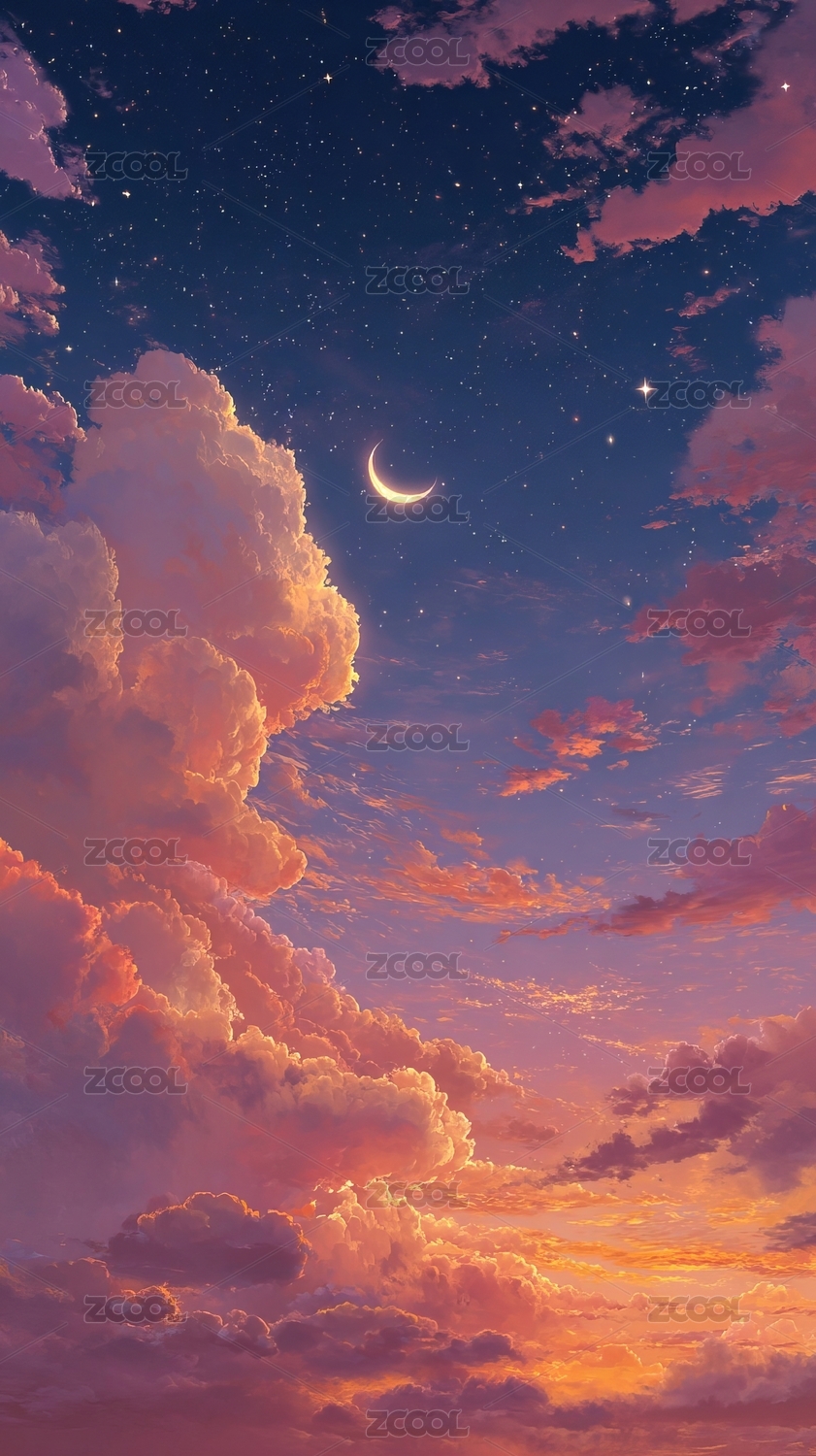 梦幻星空下的新月与彩云