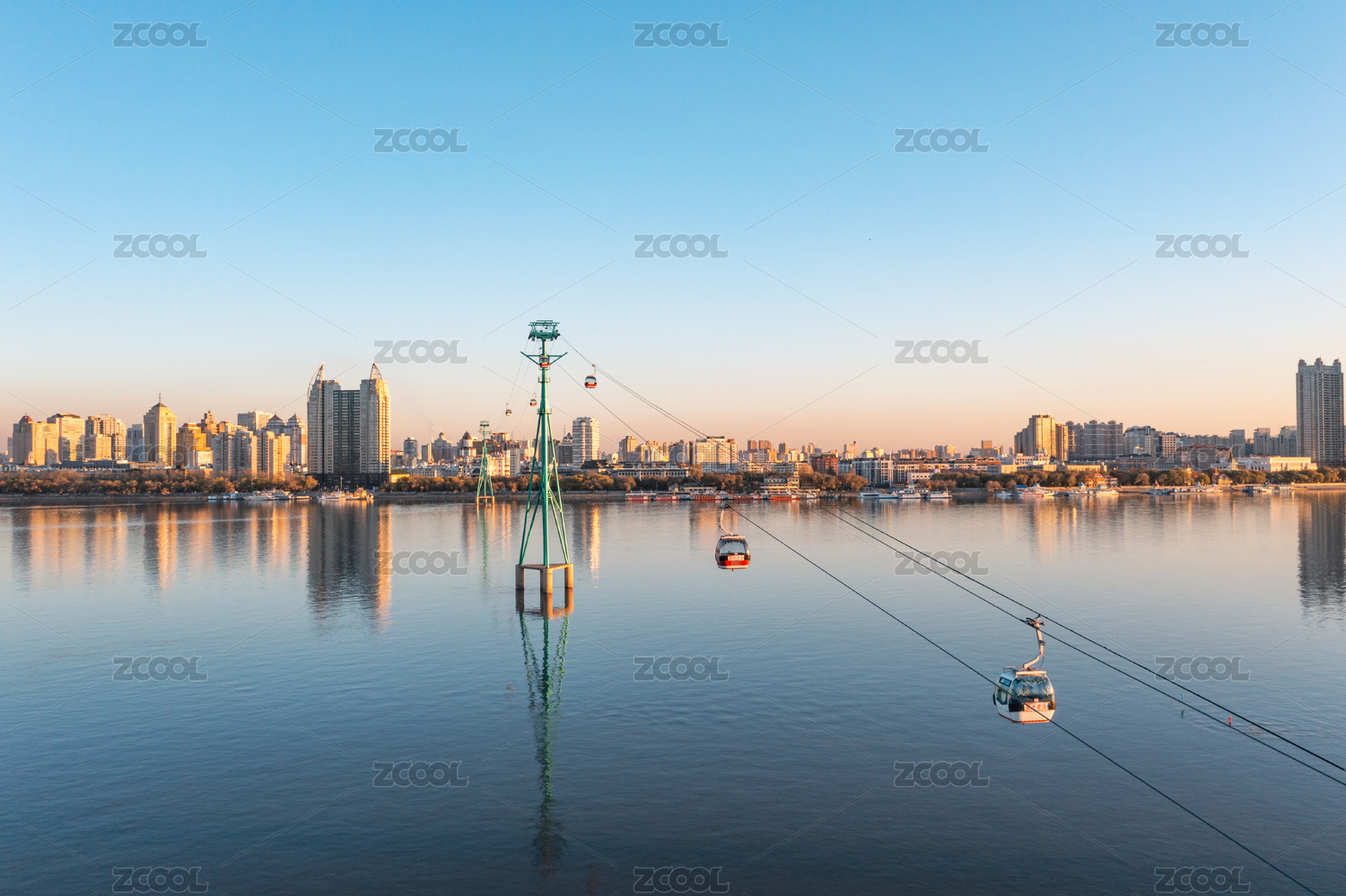 黑龙江哈尔滨城市天际线与松花江的日落美景