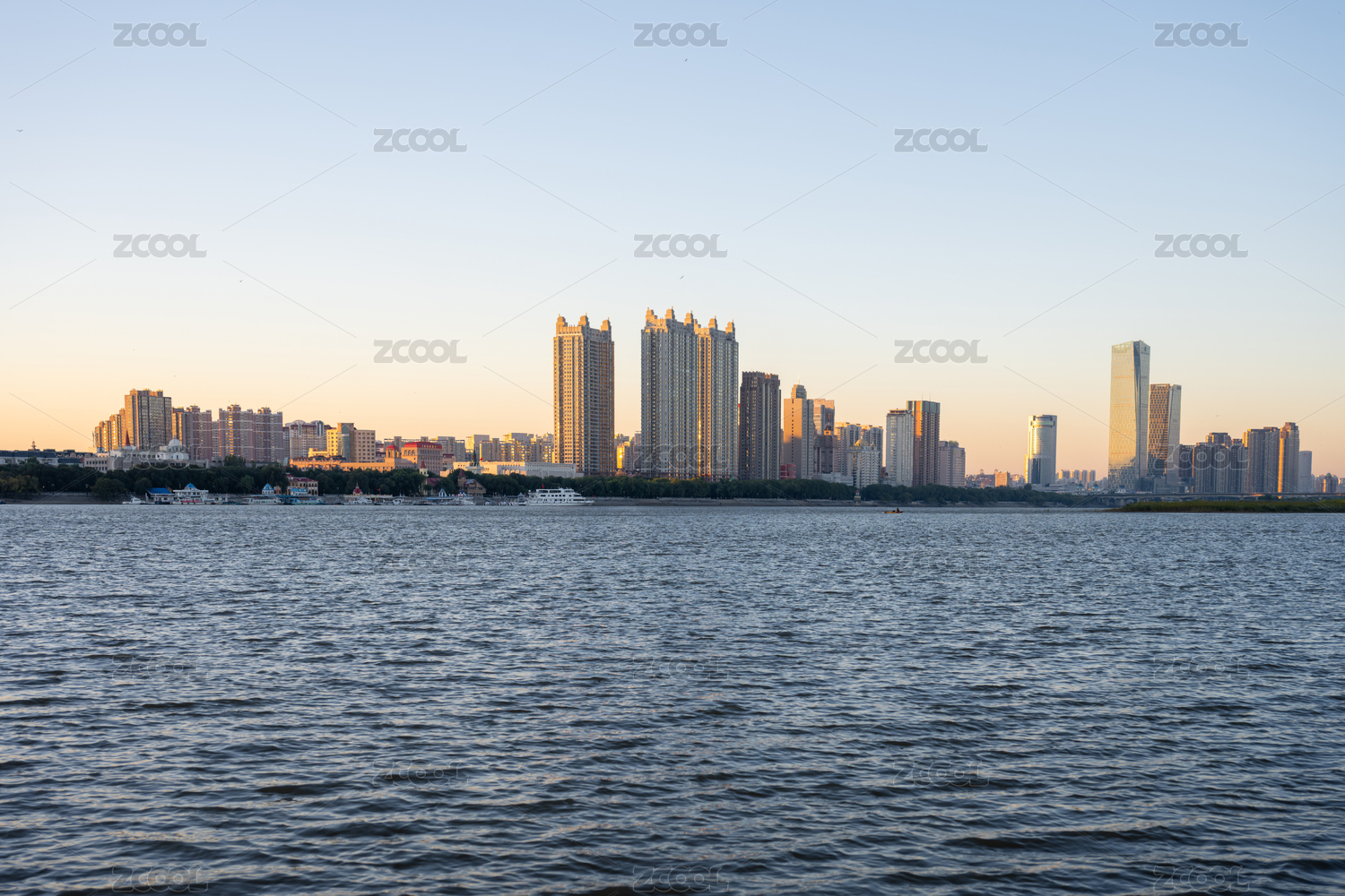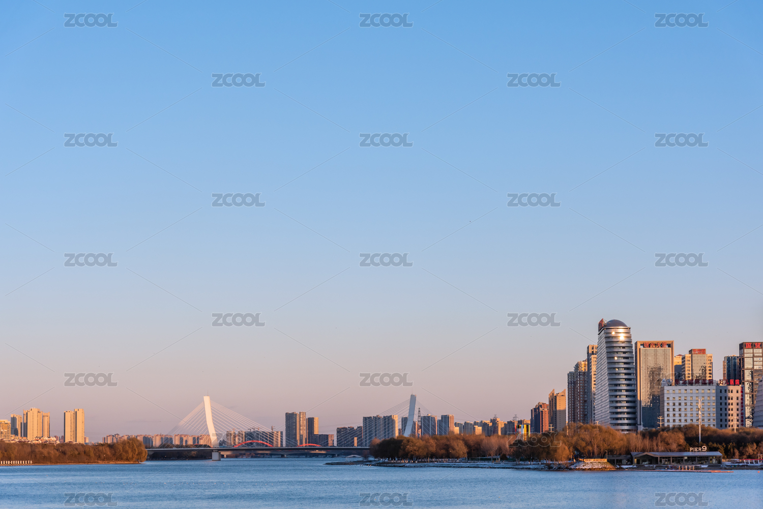 黑龙江哈尔滨城市天际线与松花江日落景色