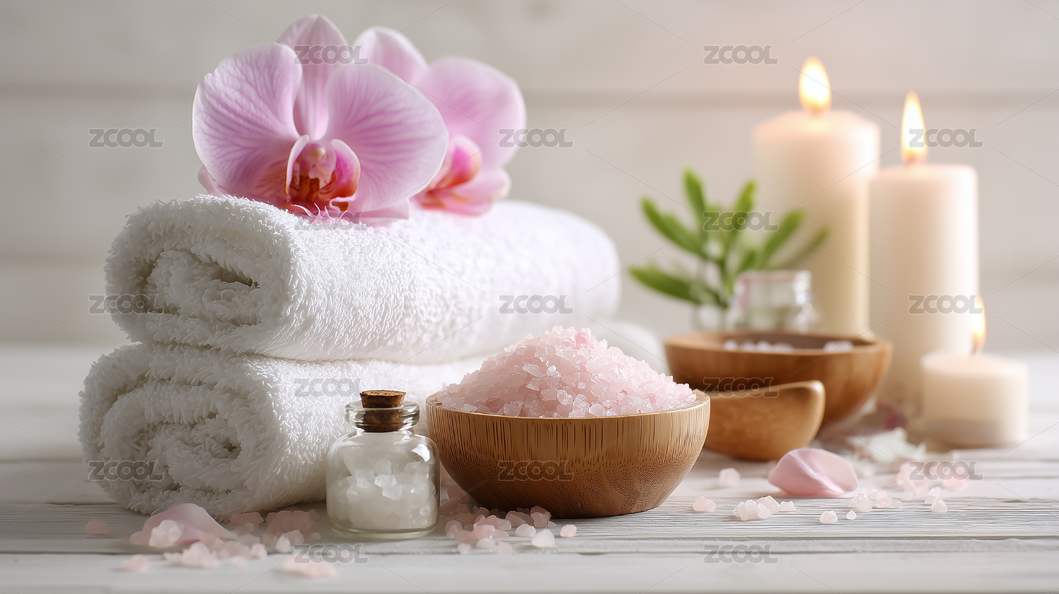 水烛,烛光,水波,石头,石块,毛巾,叠放,叶子,兰花,花朵