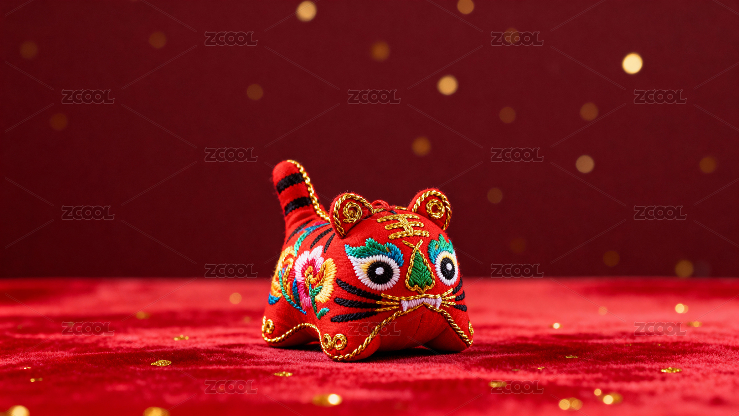 红色绣花老虎玩偶背景虚化
