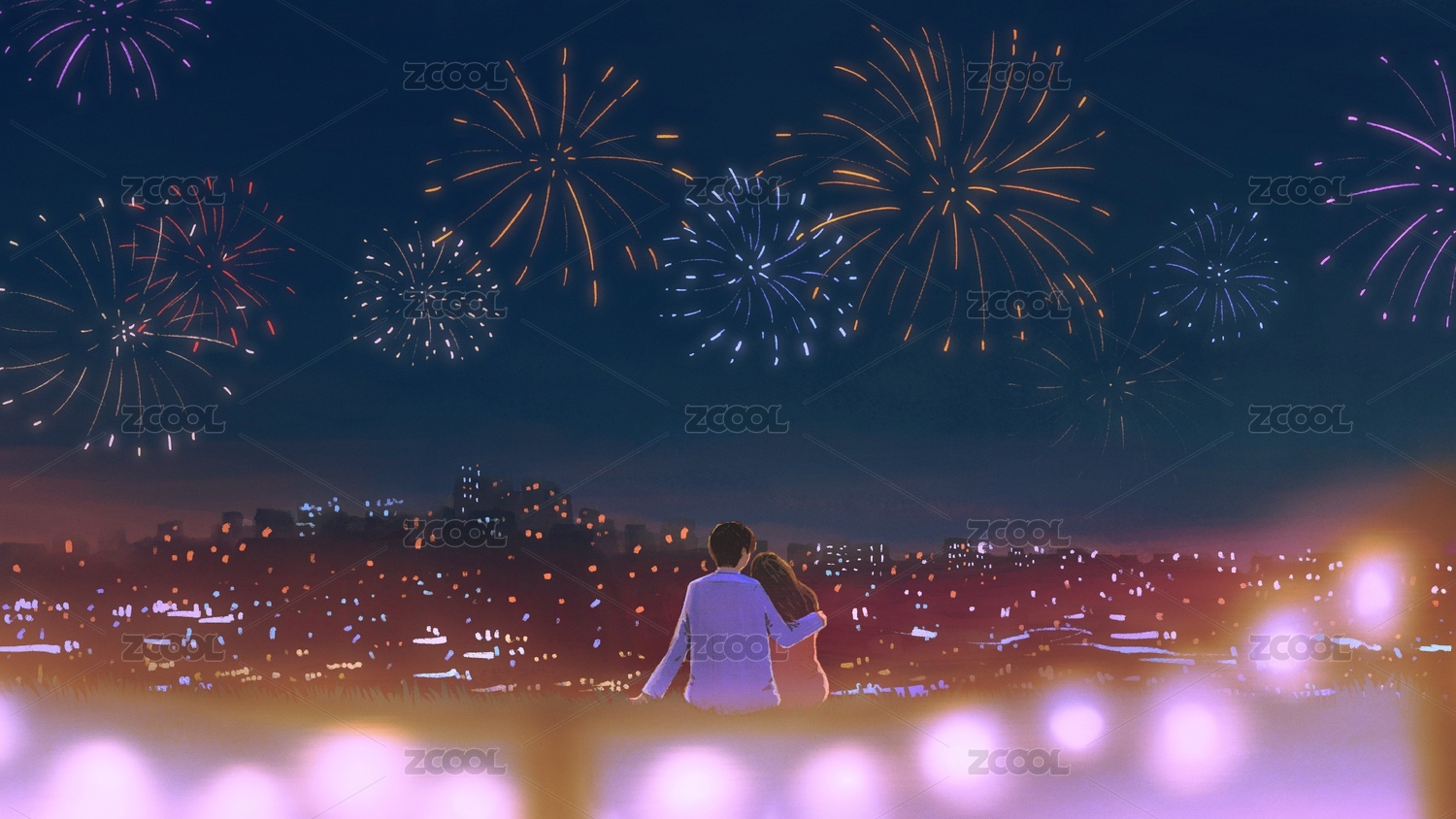 情侣在城市天台看夜晚烟花浪漫唯美治愈插画