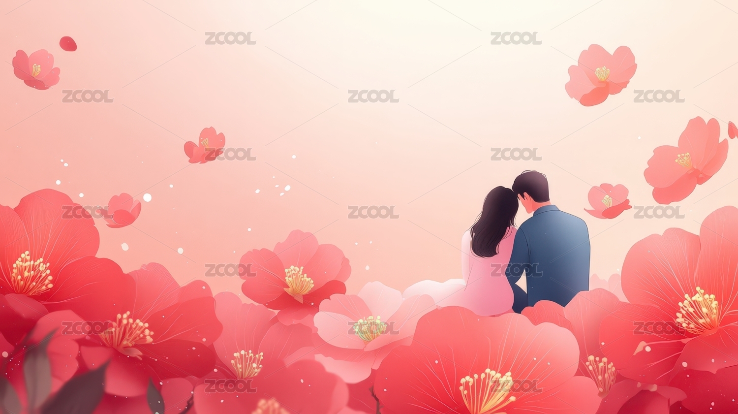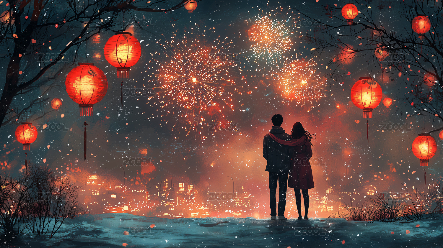 新年,春节,插画,节日,庆祝,红色背景,过年,烟花,喜庆,情侣