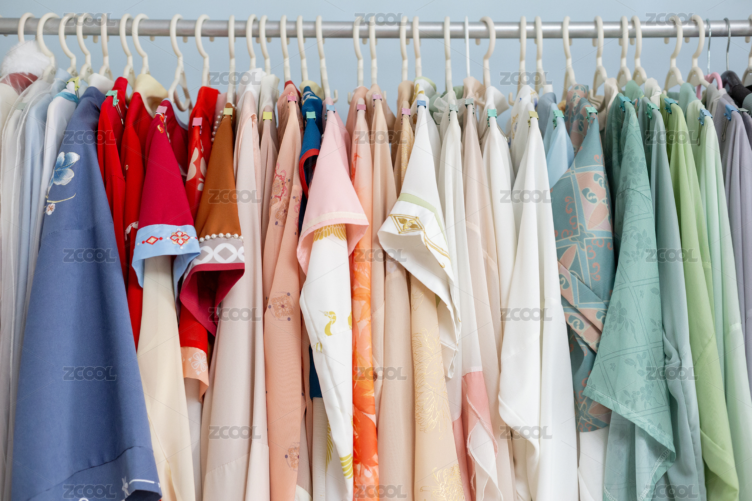 衣架上挂着的一排不同式样的汉服