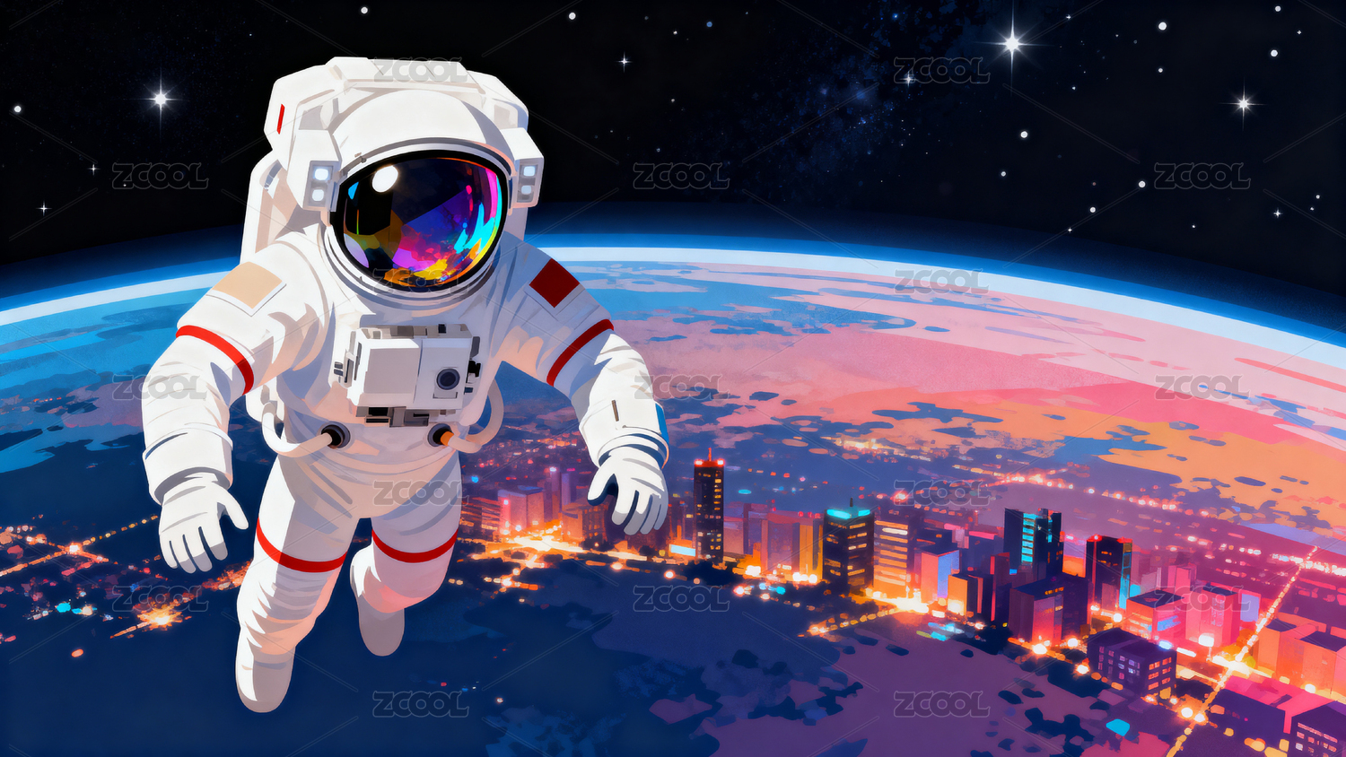 宇航员太空漫步城市夜景