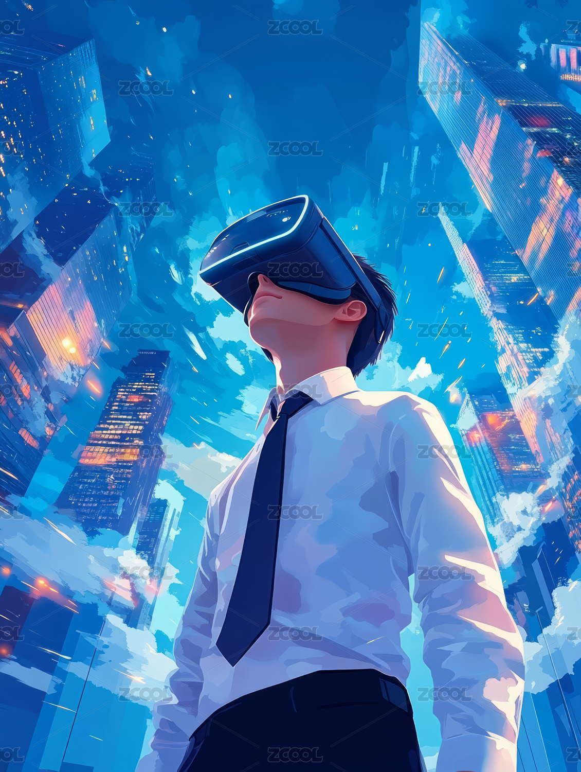 戴着VR眼镜的商务人士进入虚拟现实空间