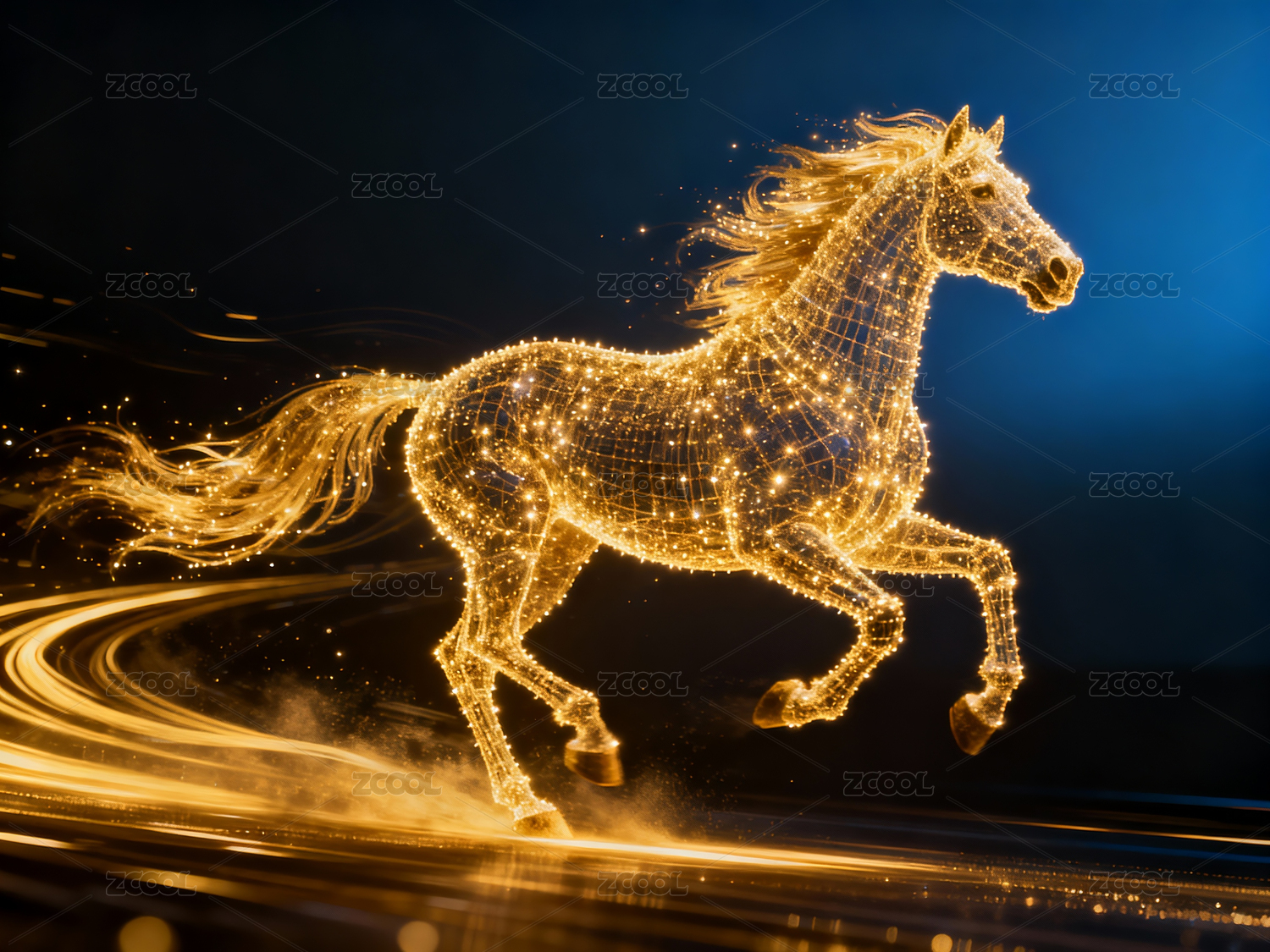 蓝色光点骏马奔跑于流光波浪之上