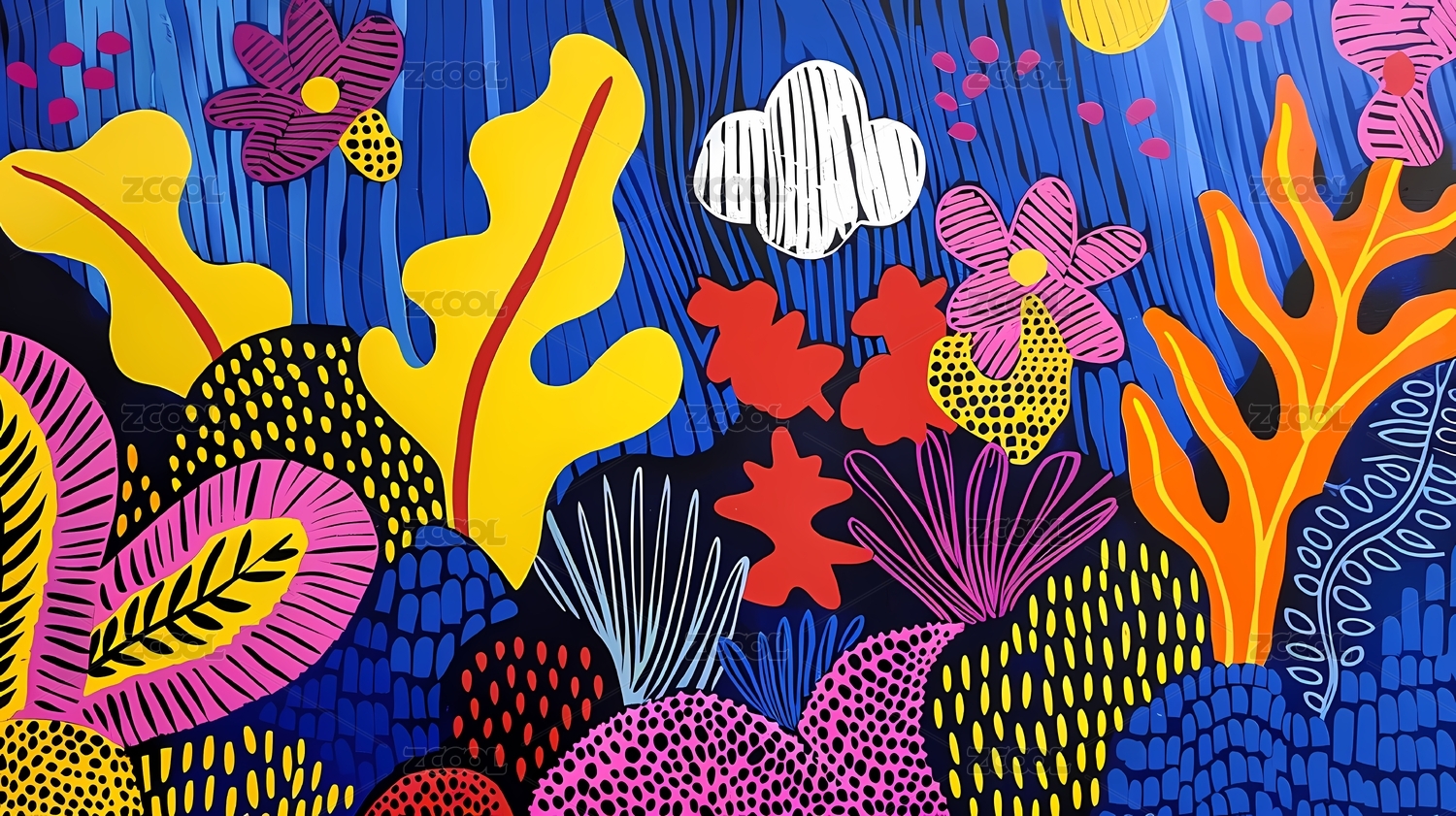 复古彩色的花和云图案插画海报背景