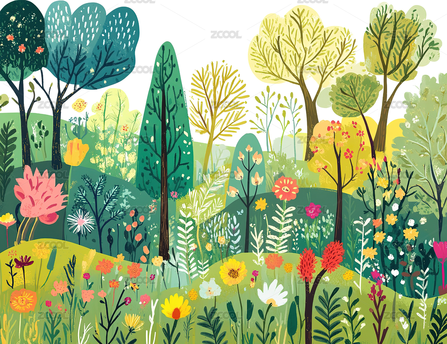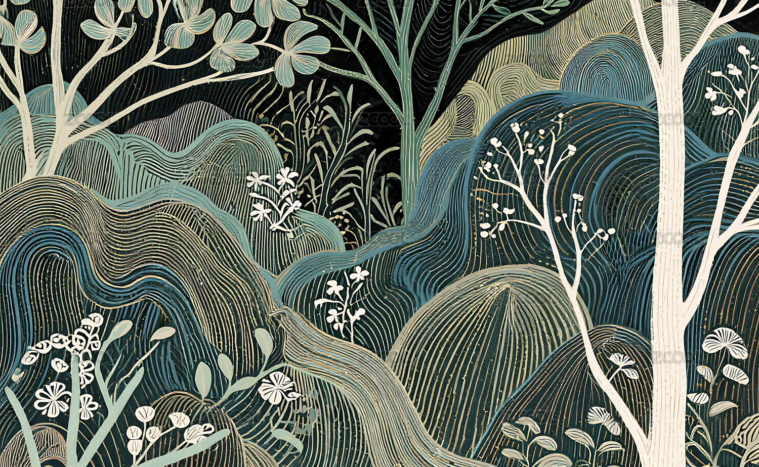 传统图案风格的树林插画艺术