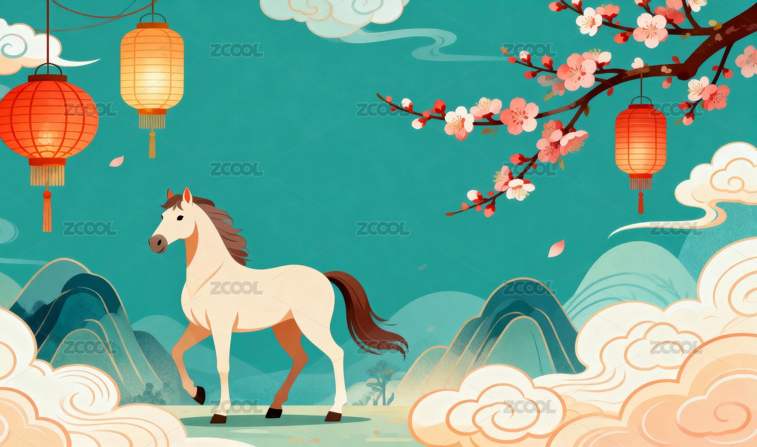 马,梅花,灯笼,国潮,新春,卡通,红色,中国风,喜庆,传统