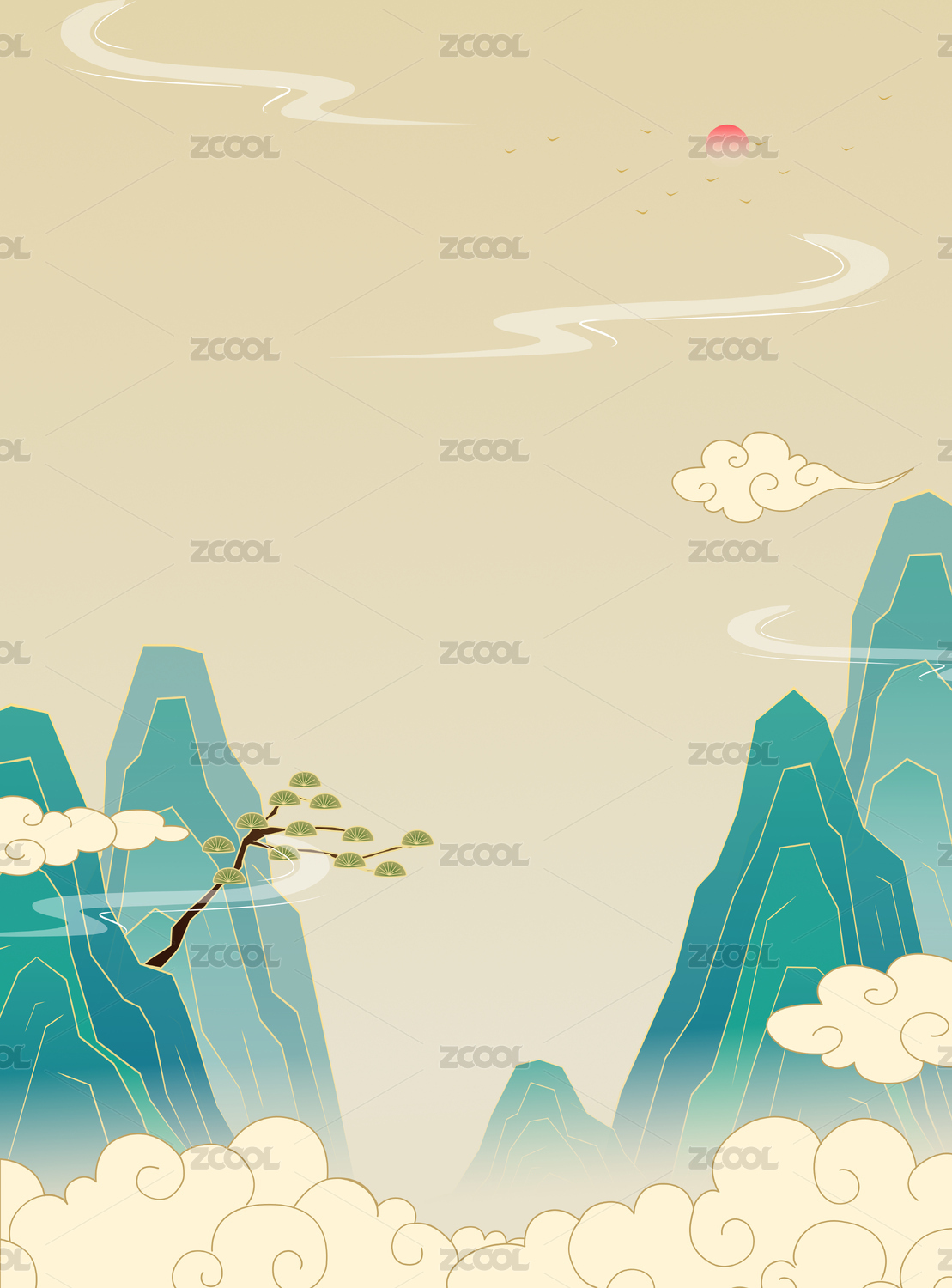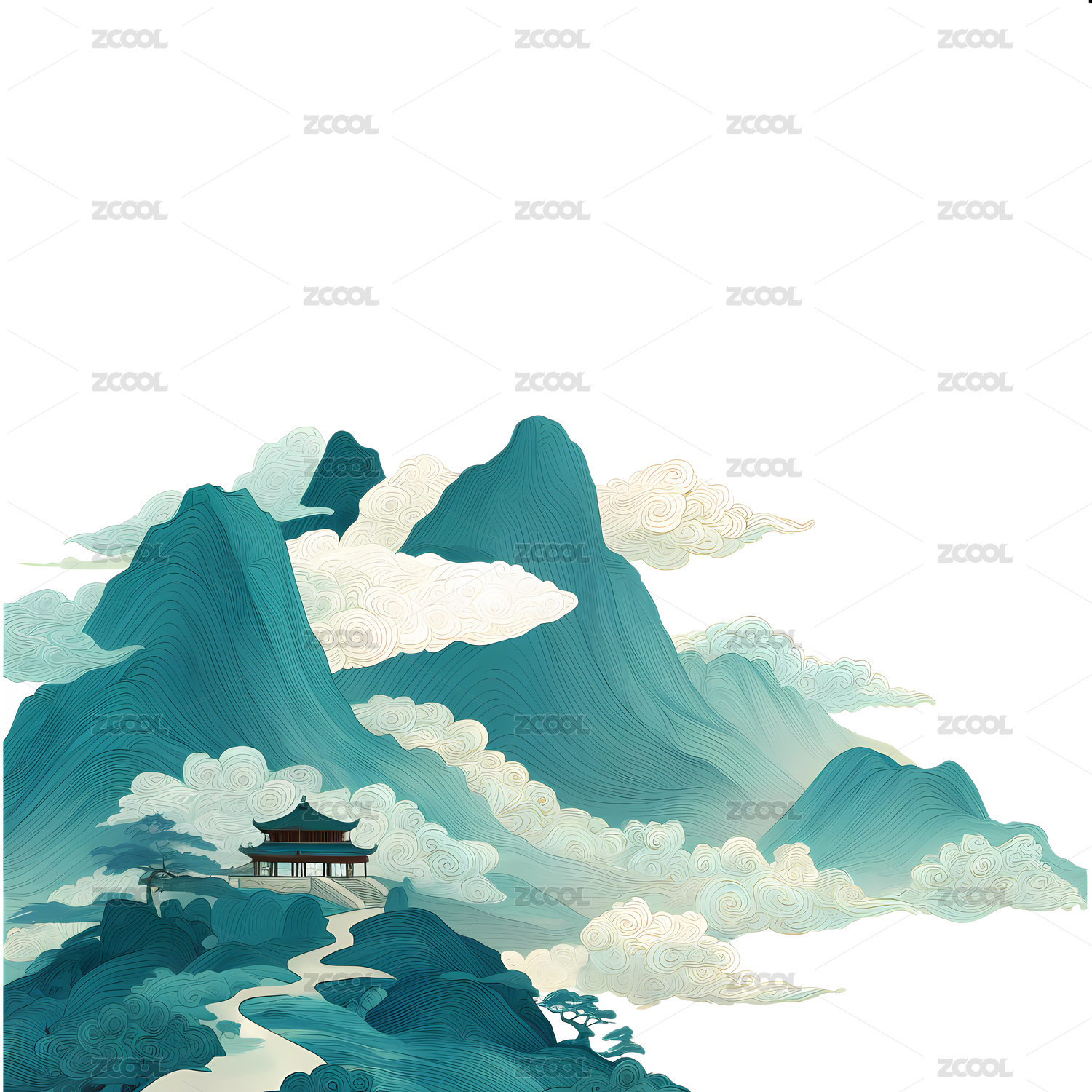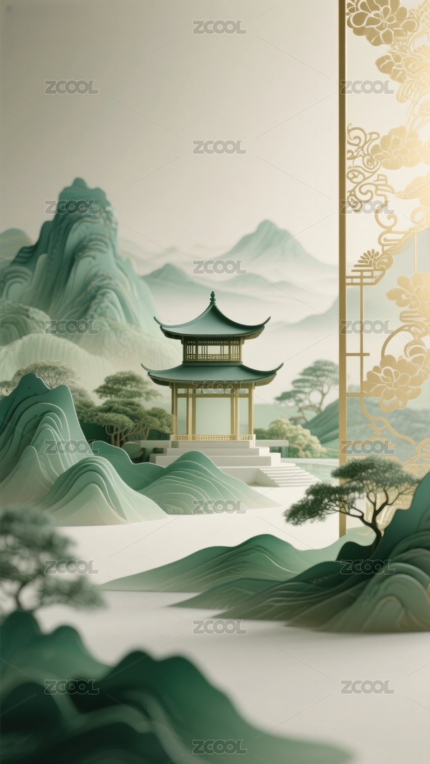 古风,山水,亭台,青绿,楼阁,云雾,山峰,中国风,水墨画,金色边框