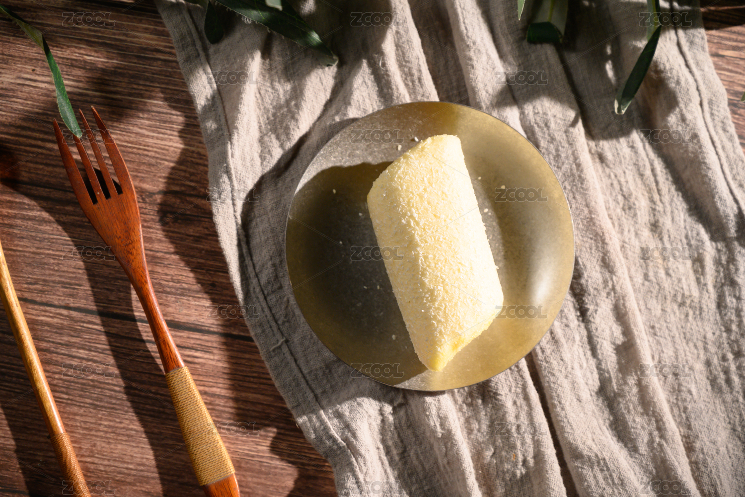桌面上的盘子里的美味可口的蛋糕卷