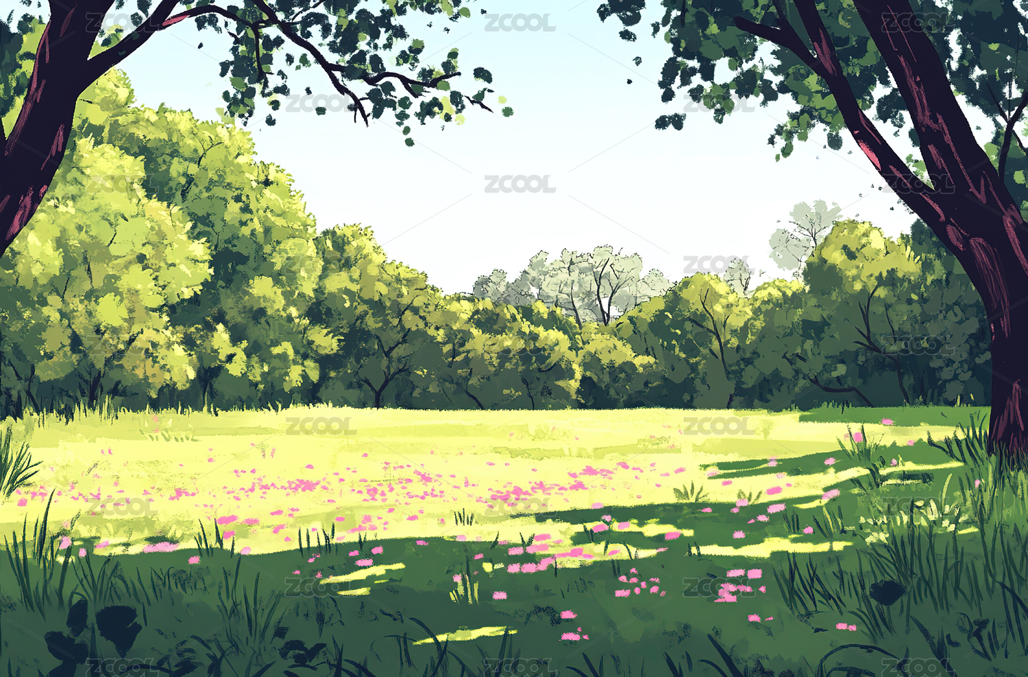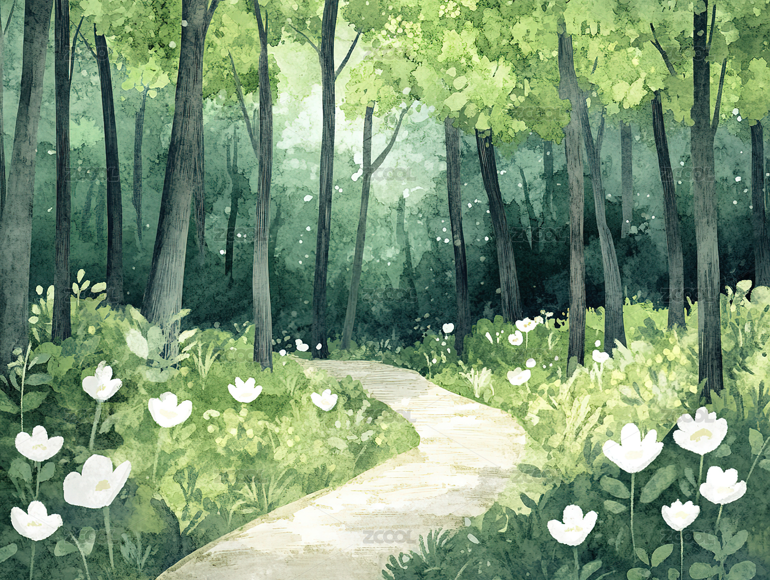 树木,绿叶,小径,草地,花朵,山丘,光线,水彩,自然,阳光