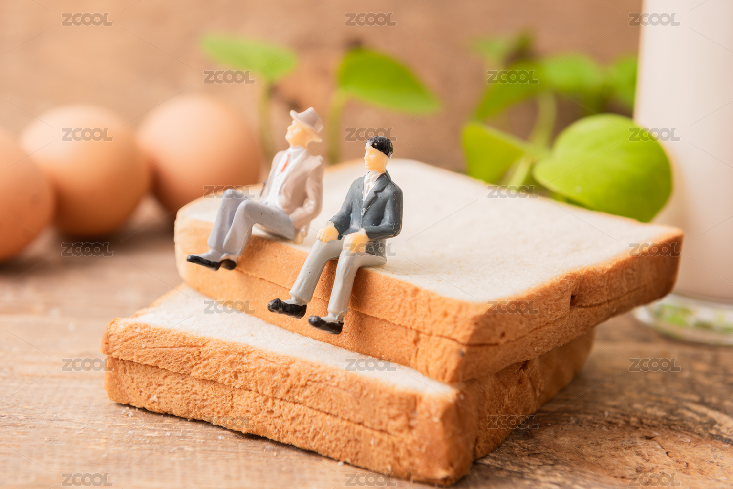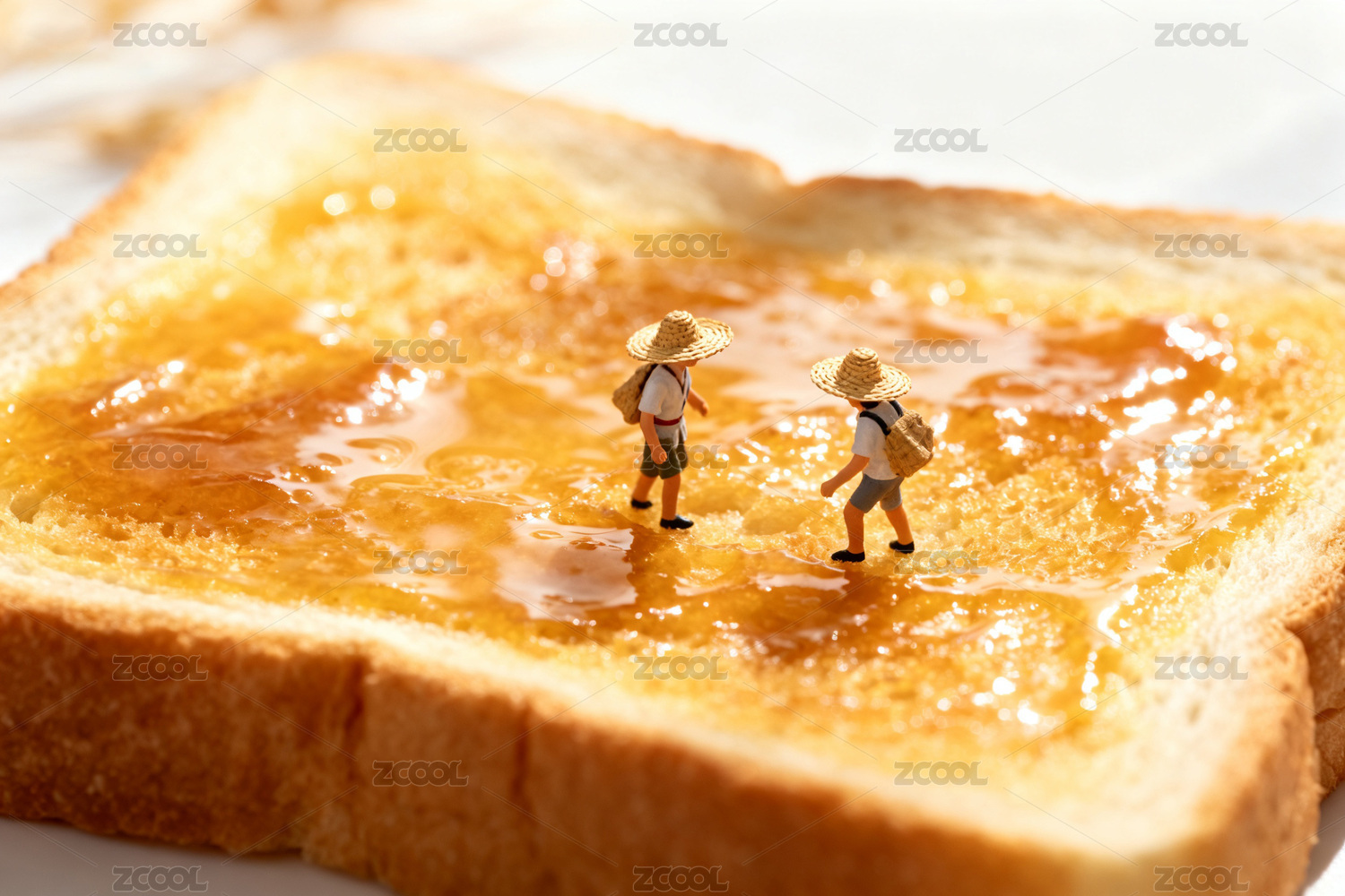 纯色背景上与吐司面包片一起忙碌的小人们。