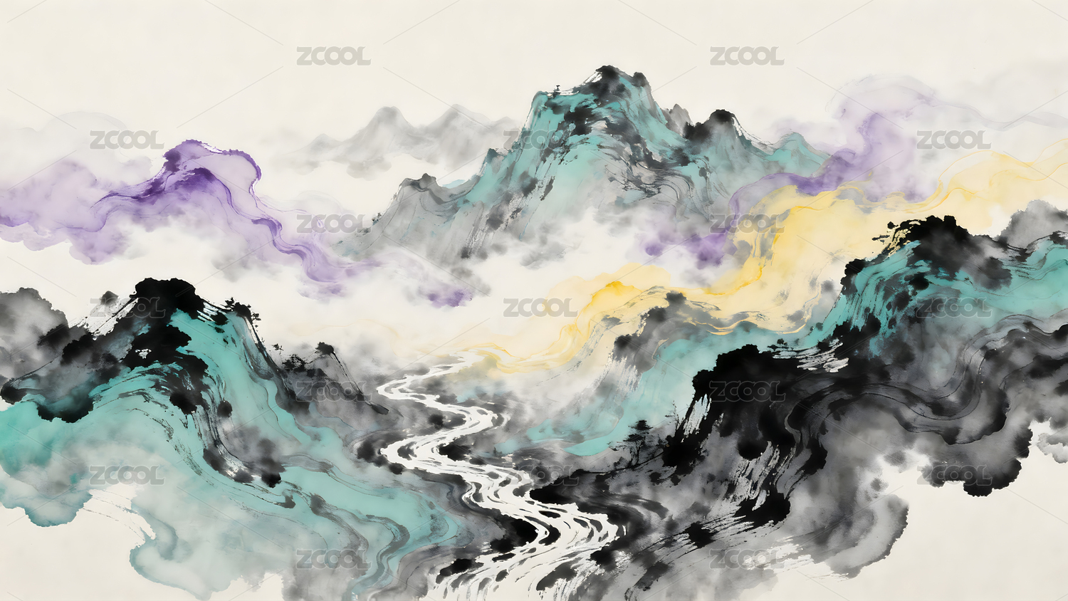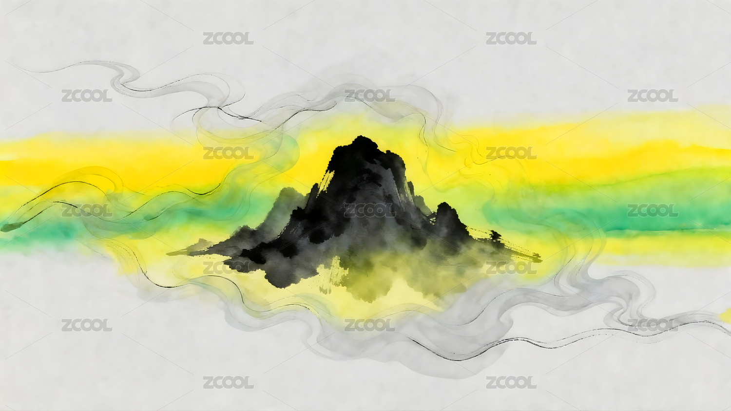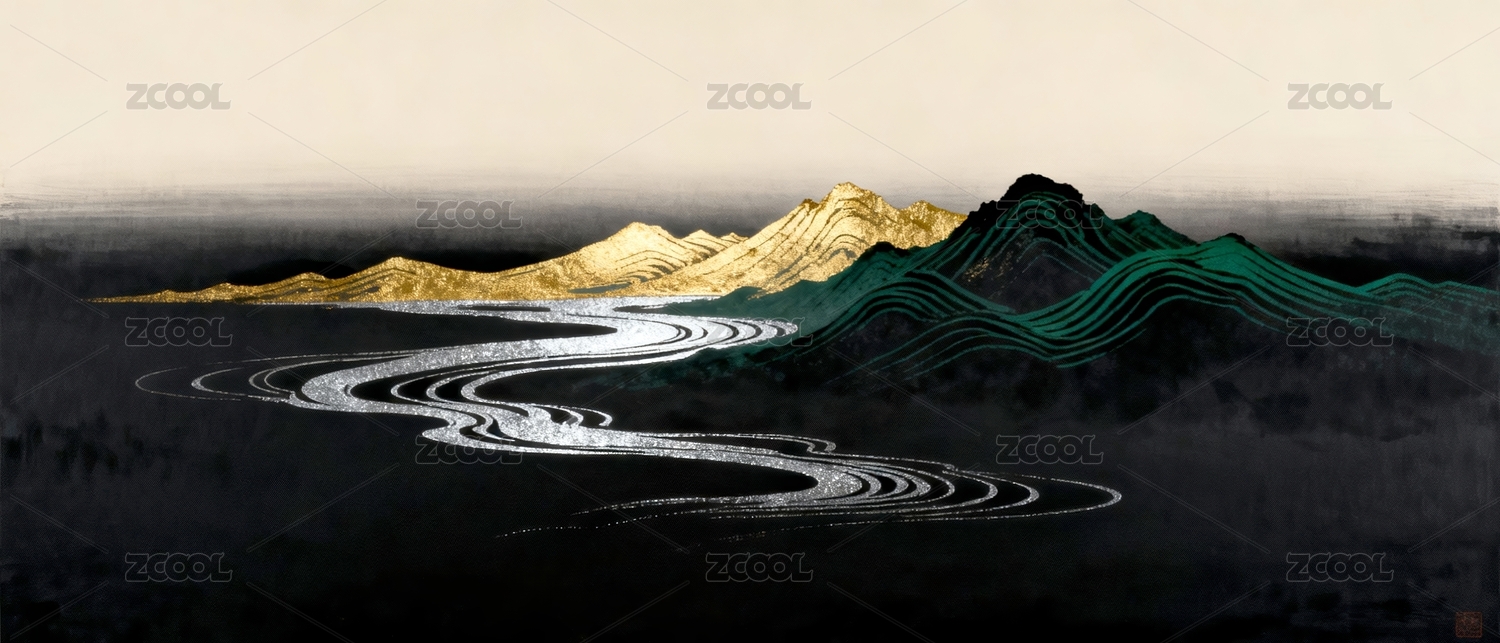 新中式,水墨,山水,黑金,云雾,意境,装饰画,金色山脉,绿色,山峦