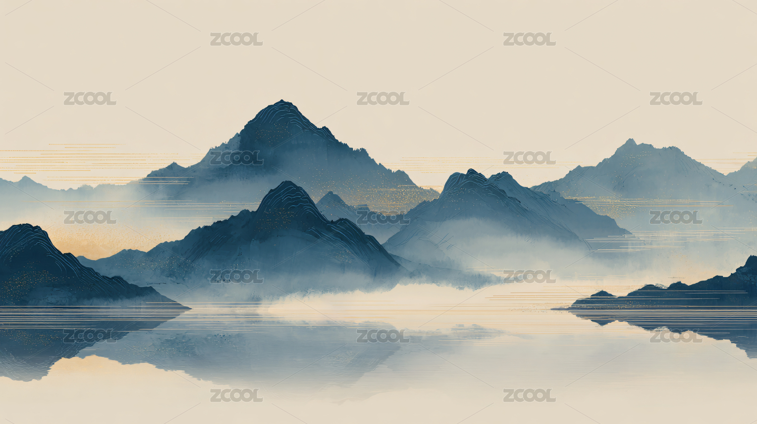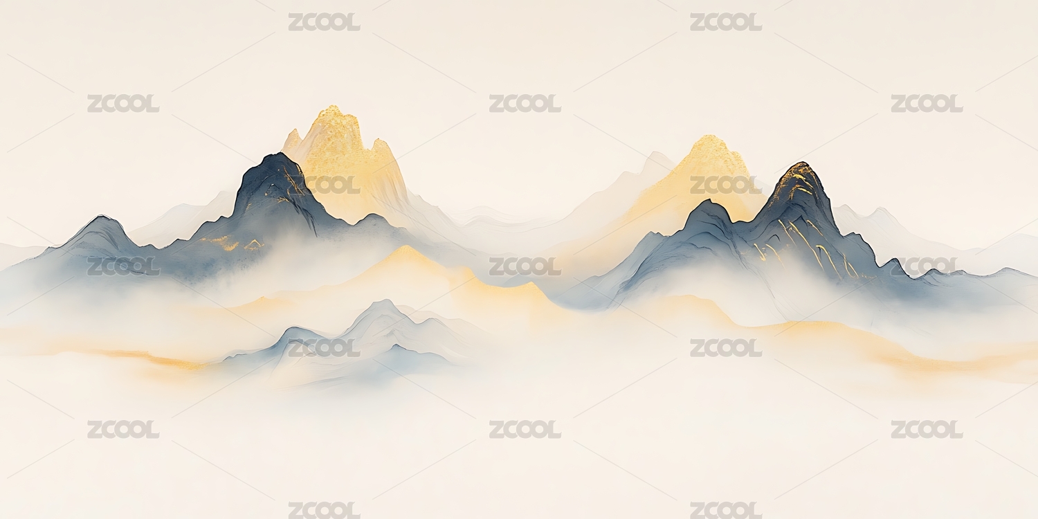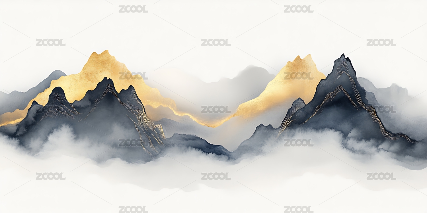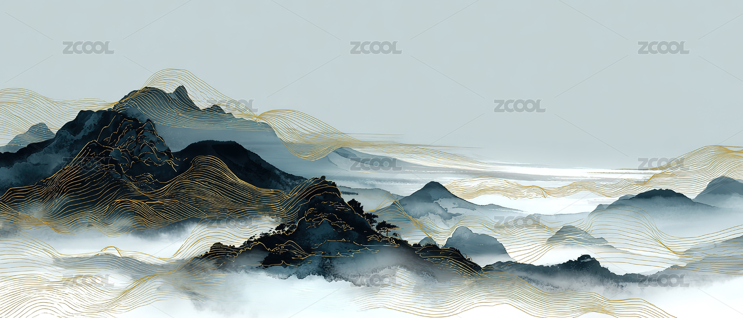 新中式,水墨,山水,黑金,云雾,意境,装饰画,金色山脉,绿色,山峦