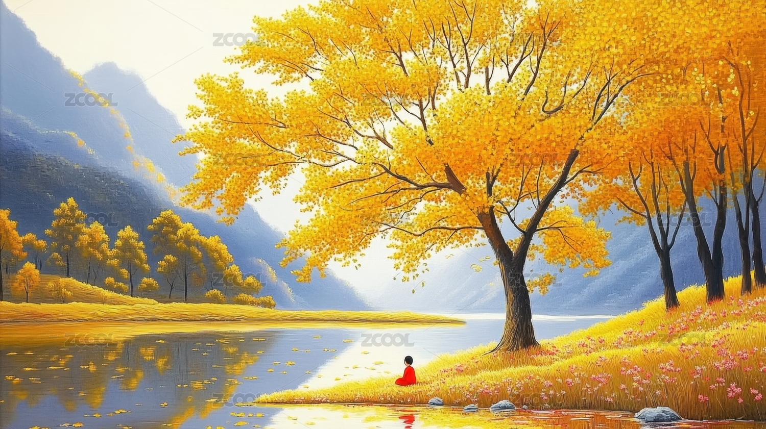 秋日金黄大树与远山剪影