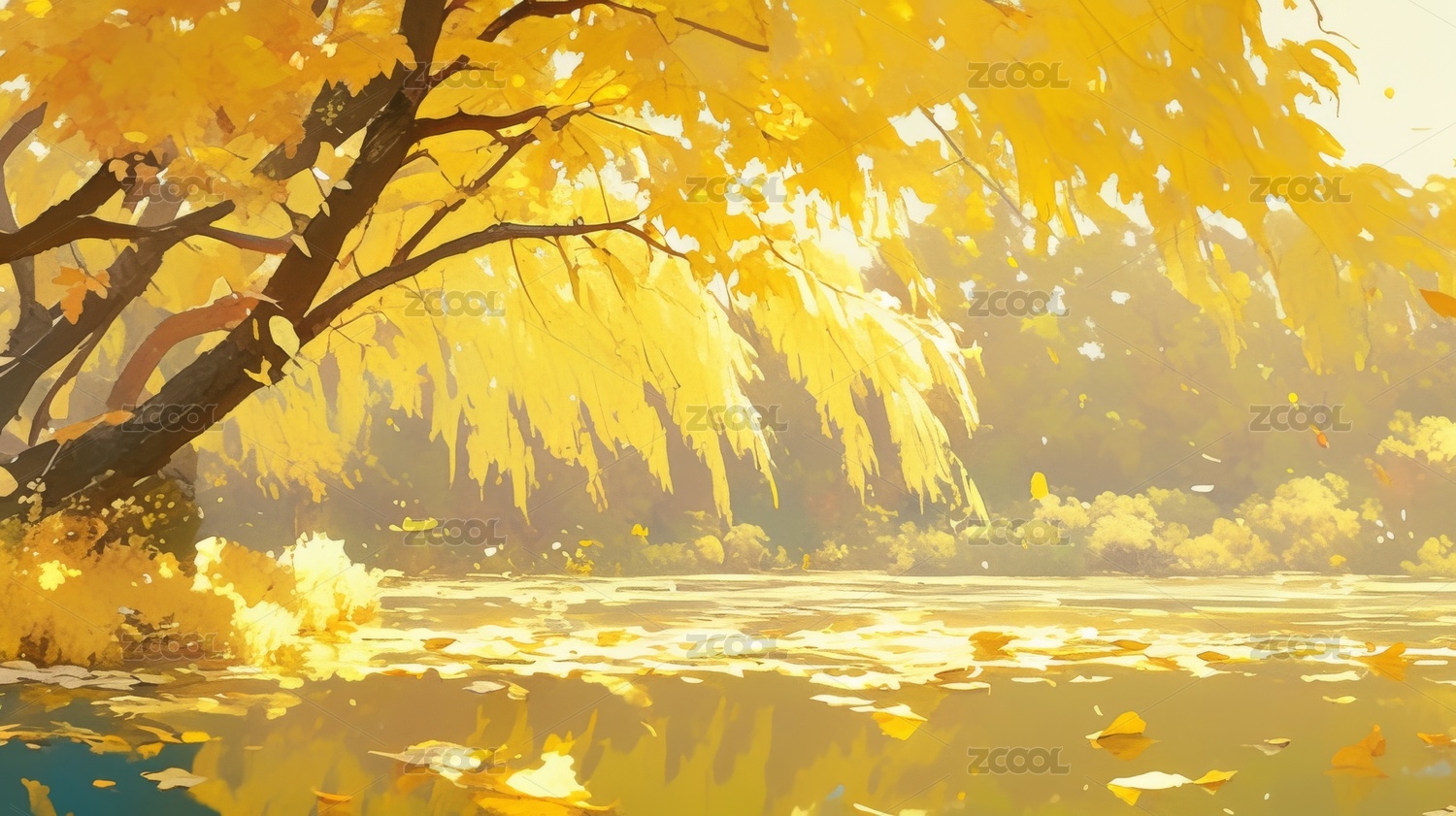 湖边柳树秋天风景
