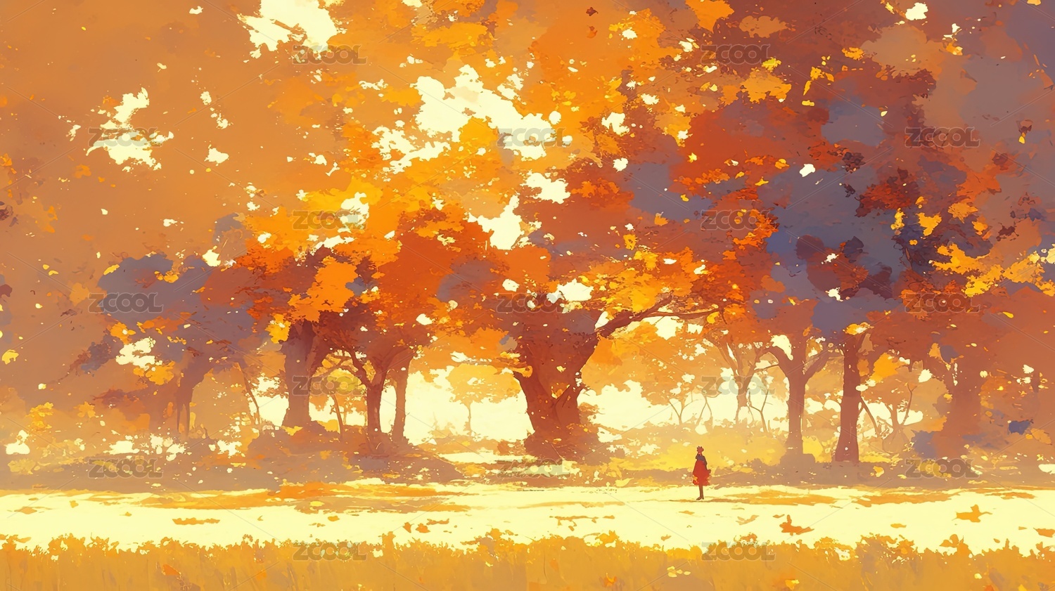 秋天女生站在金色大树下插画