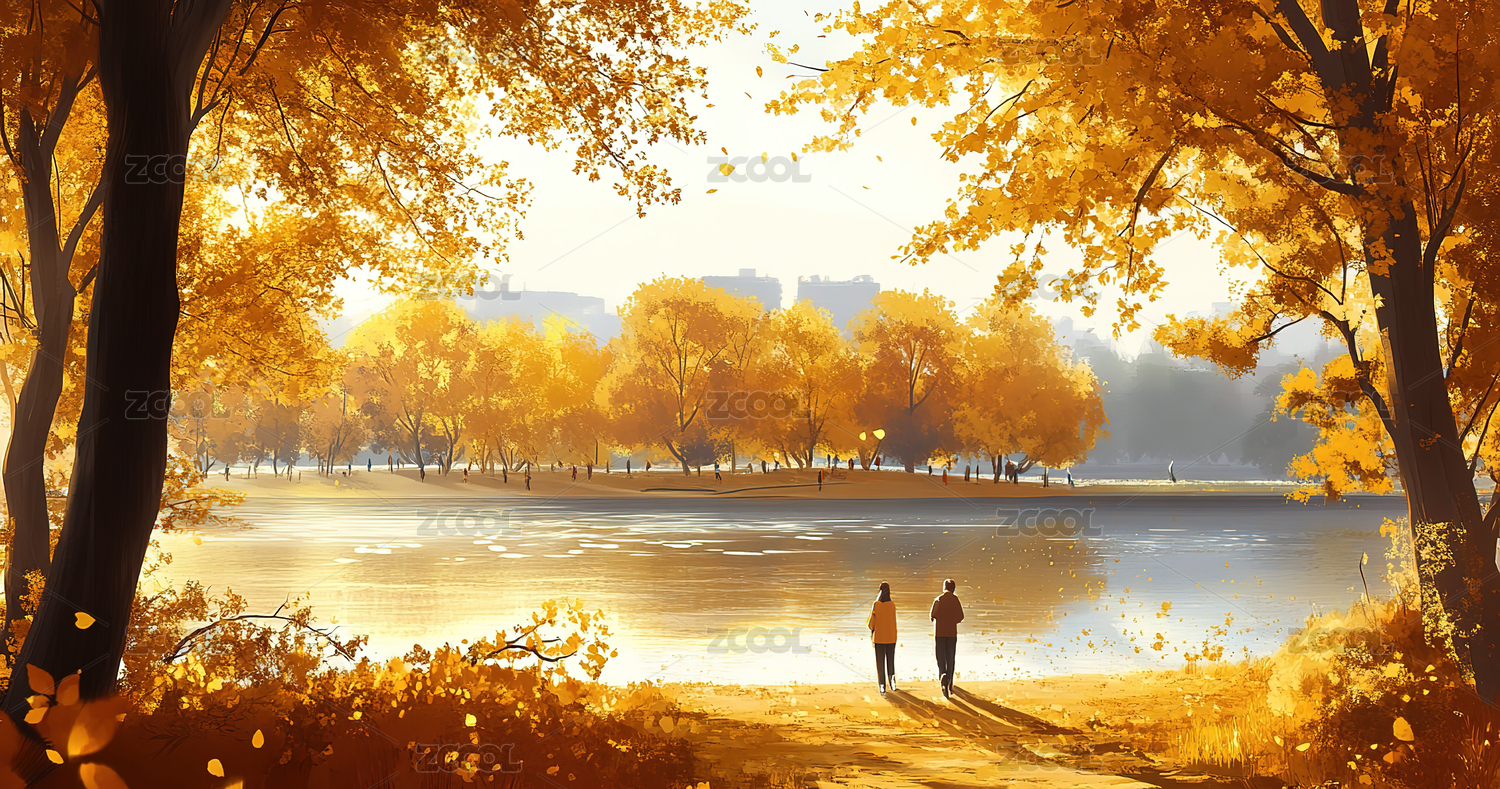 秋日湖畔行人与金黄树木
