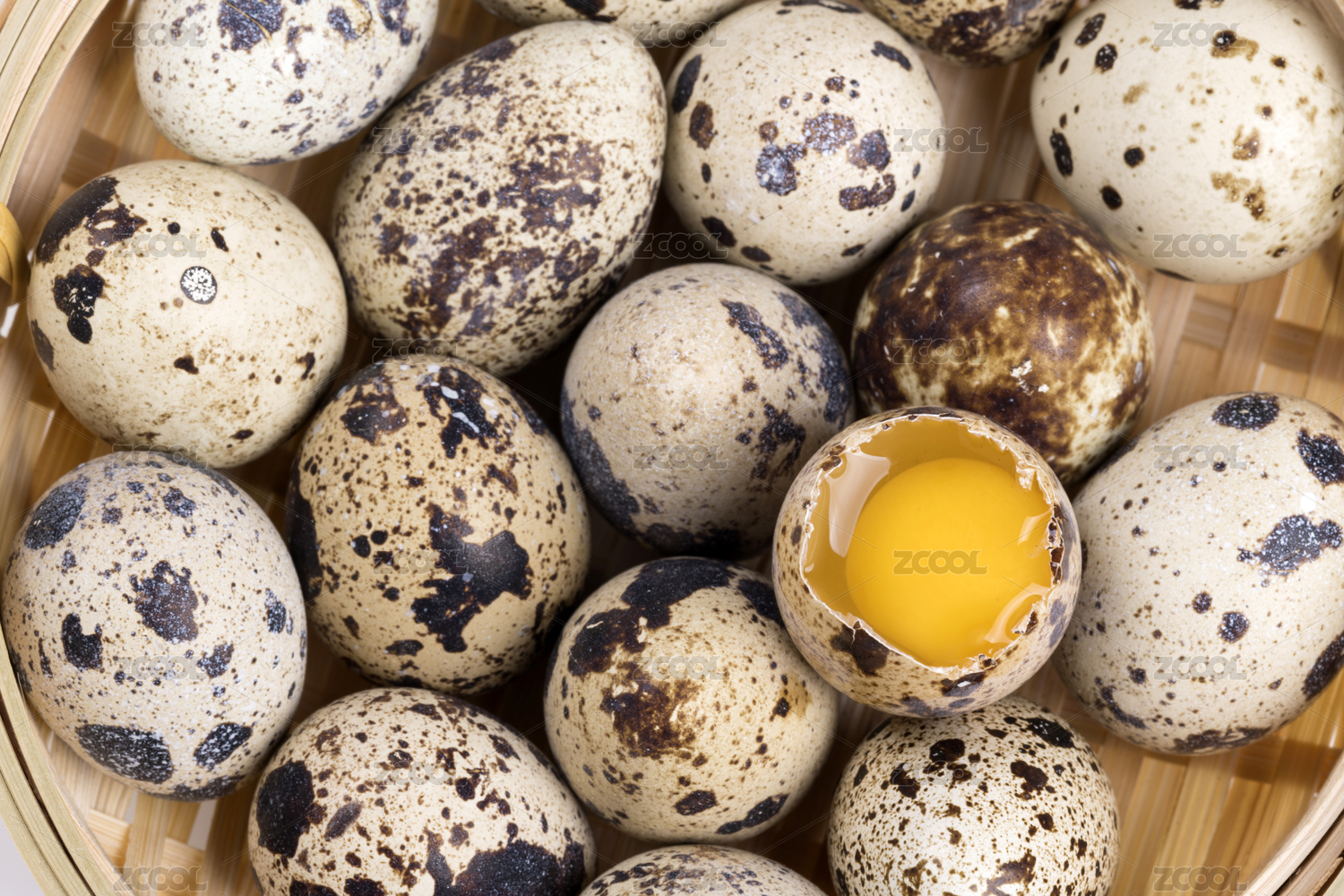 装木盘里的鹌鹑蛋,有一个敲破去壳露蛋黄