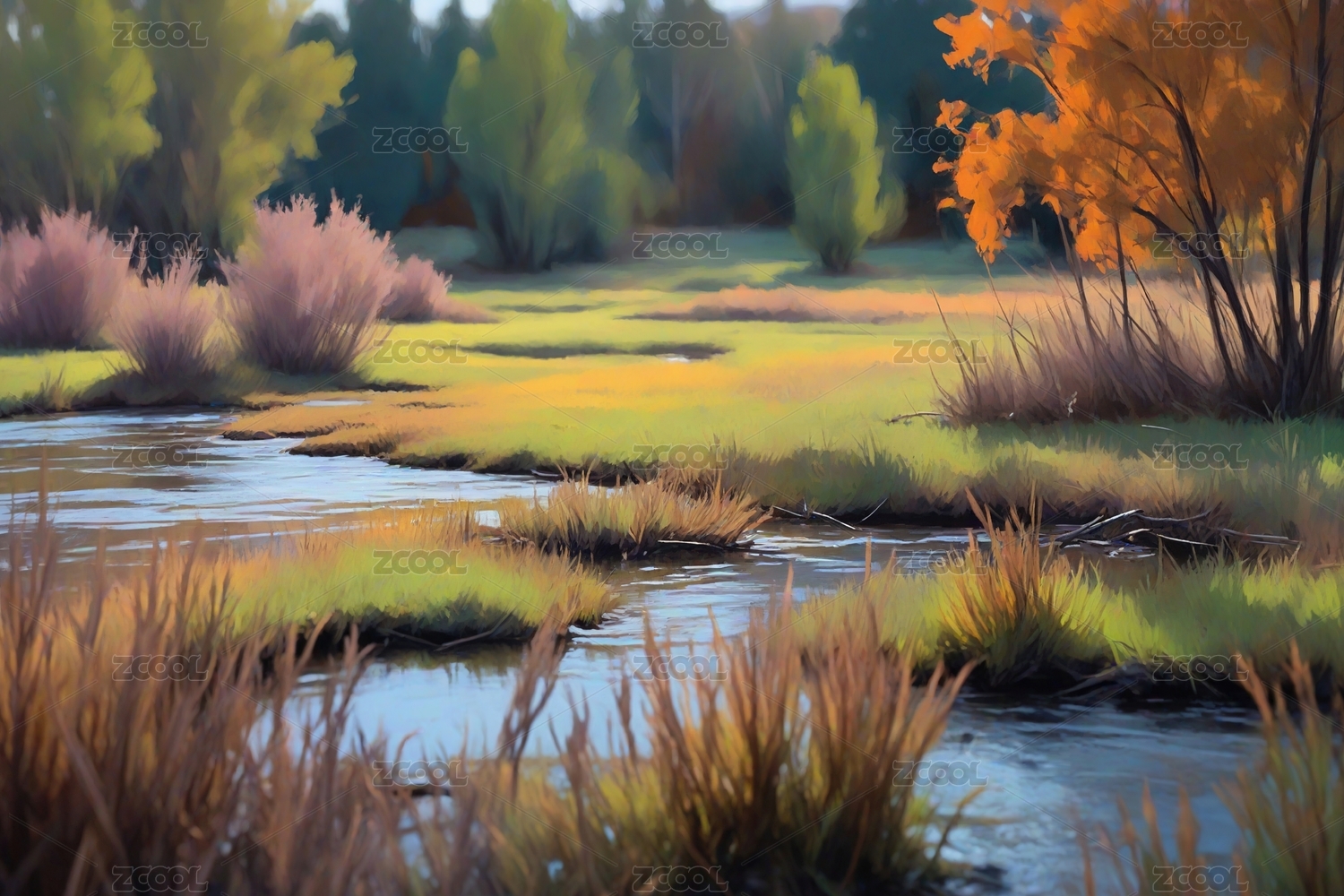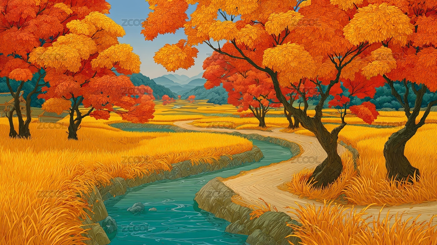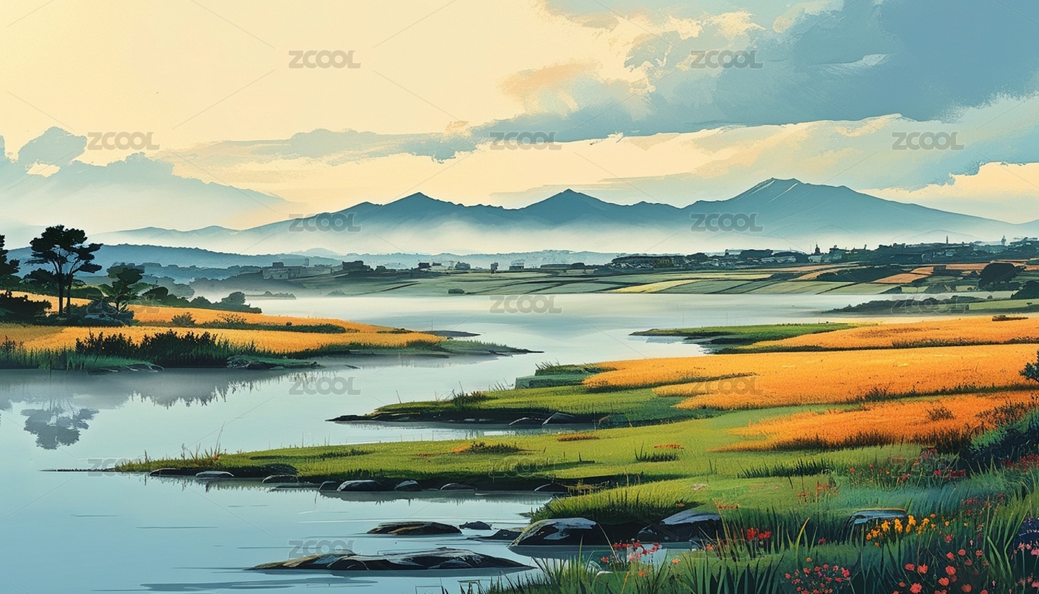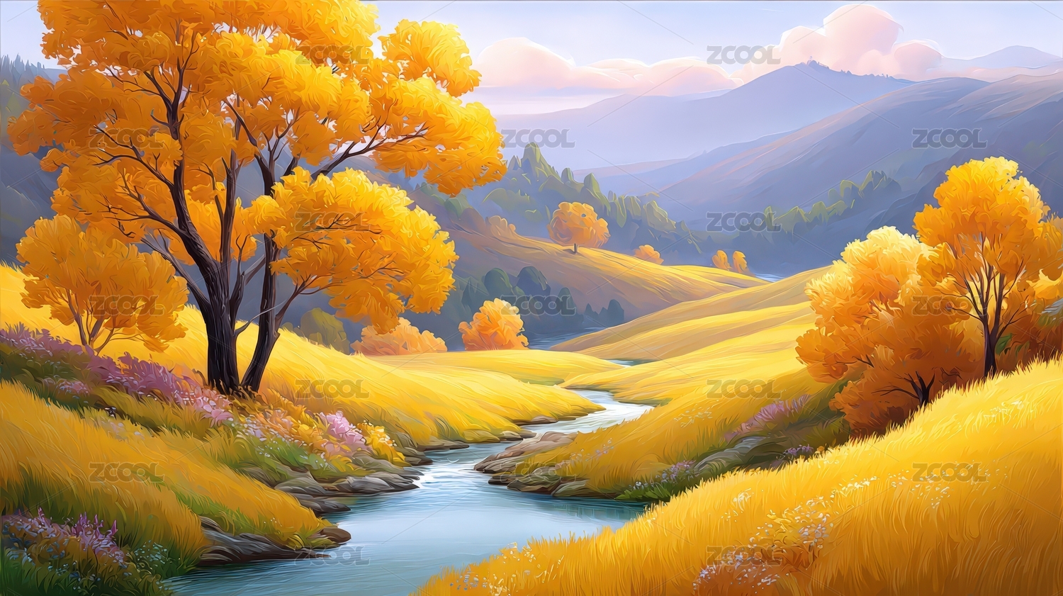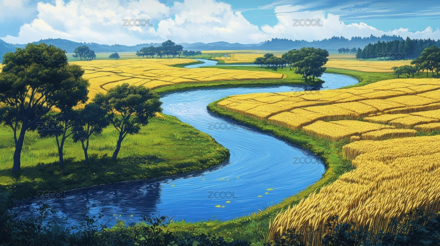 水流,自然,山水,田园,翠绿,金黄,蜿蜒,光影,清新,写意