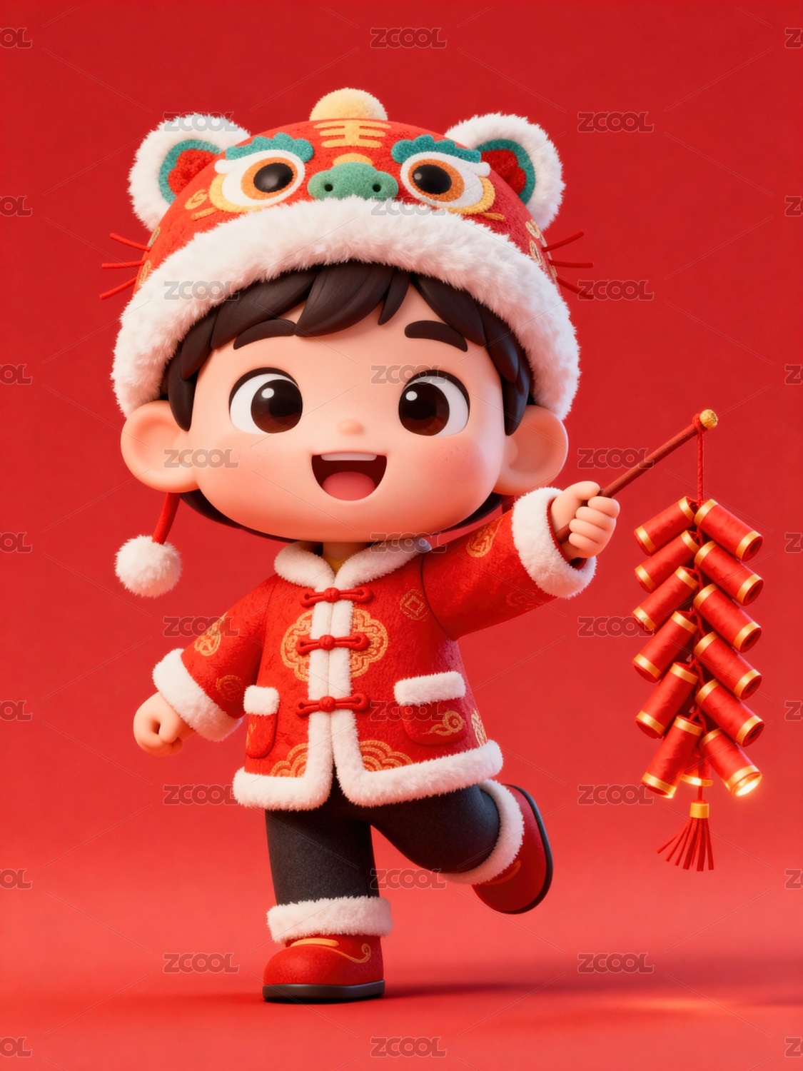 新年春节穿着传统服装拿着福字奔跑的3D女