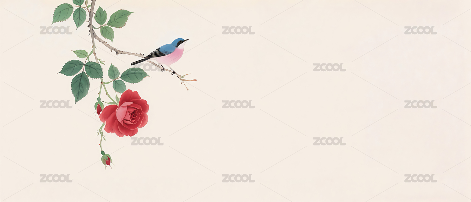 中国风水彩鸟麻雀植物树枝鲜花插画