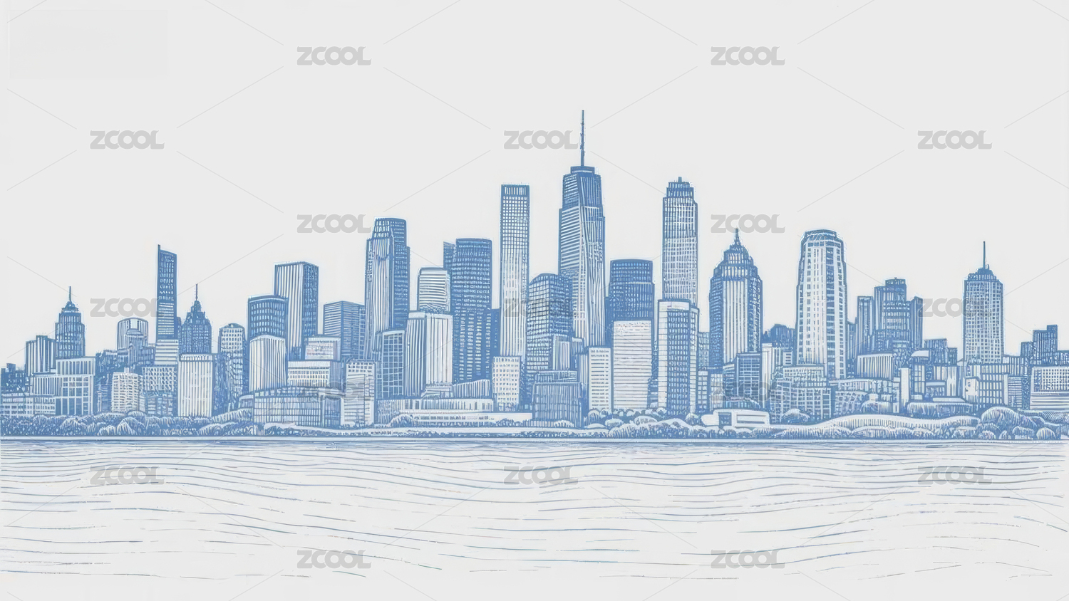 蓝色线条城市天际线插画