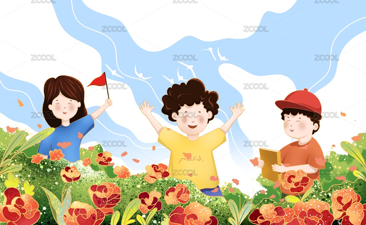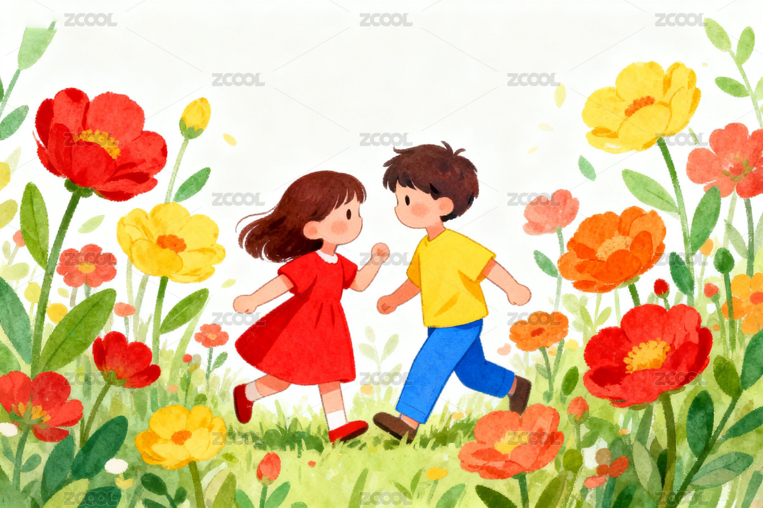 蓝色,自然,女孩,男孩,奔跑,花丛,花朵,绿色,红色,黄色