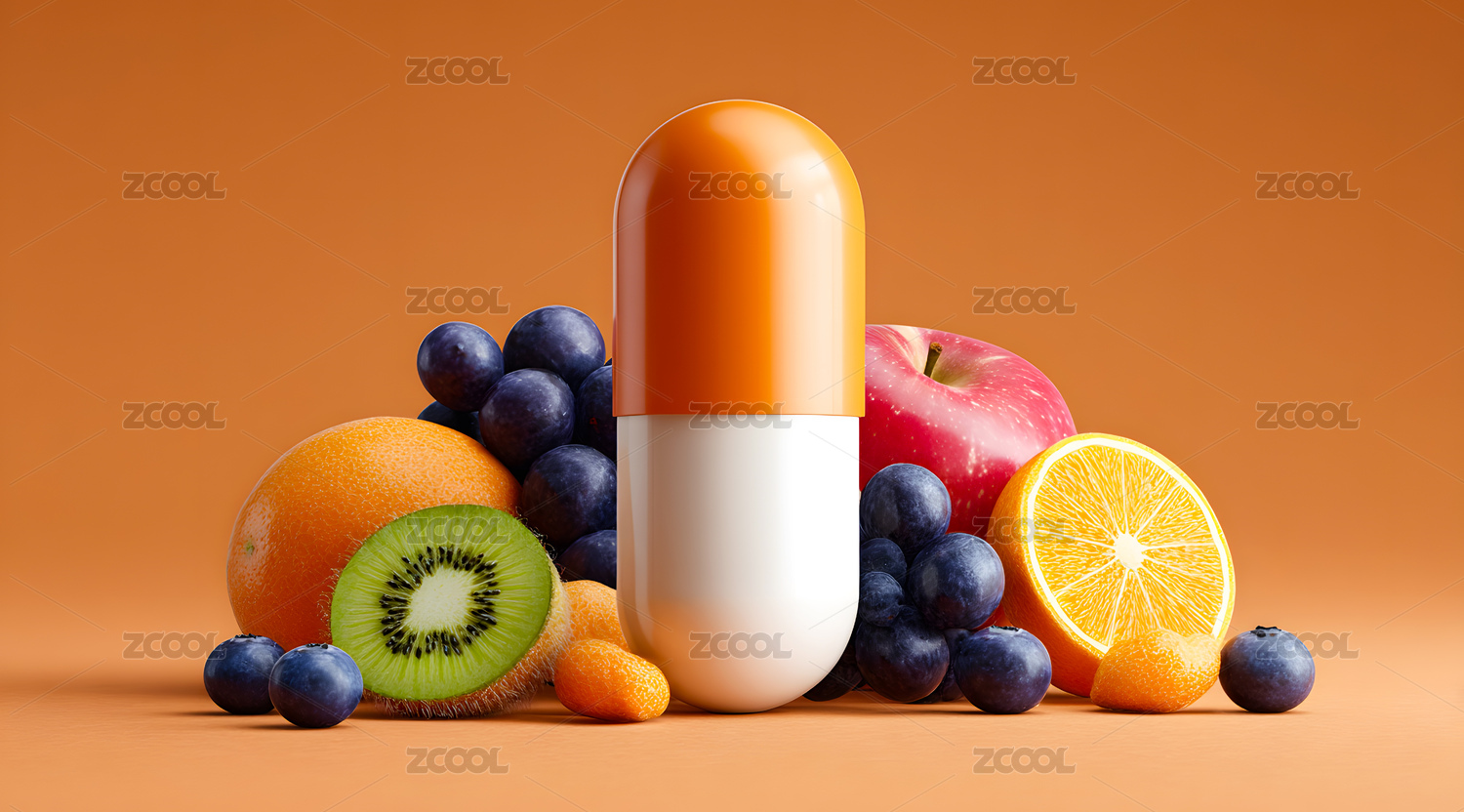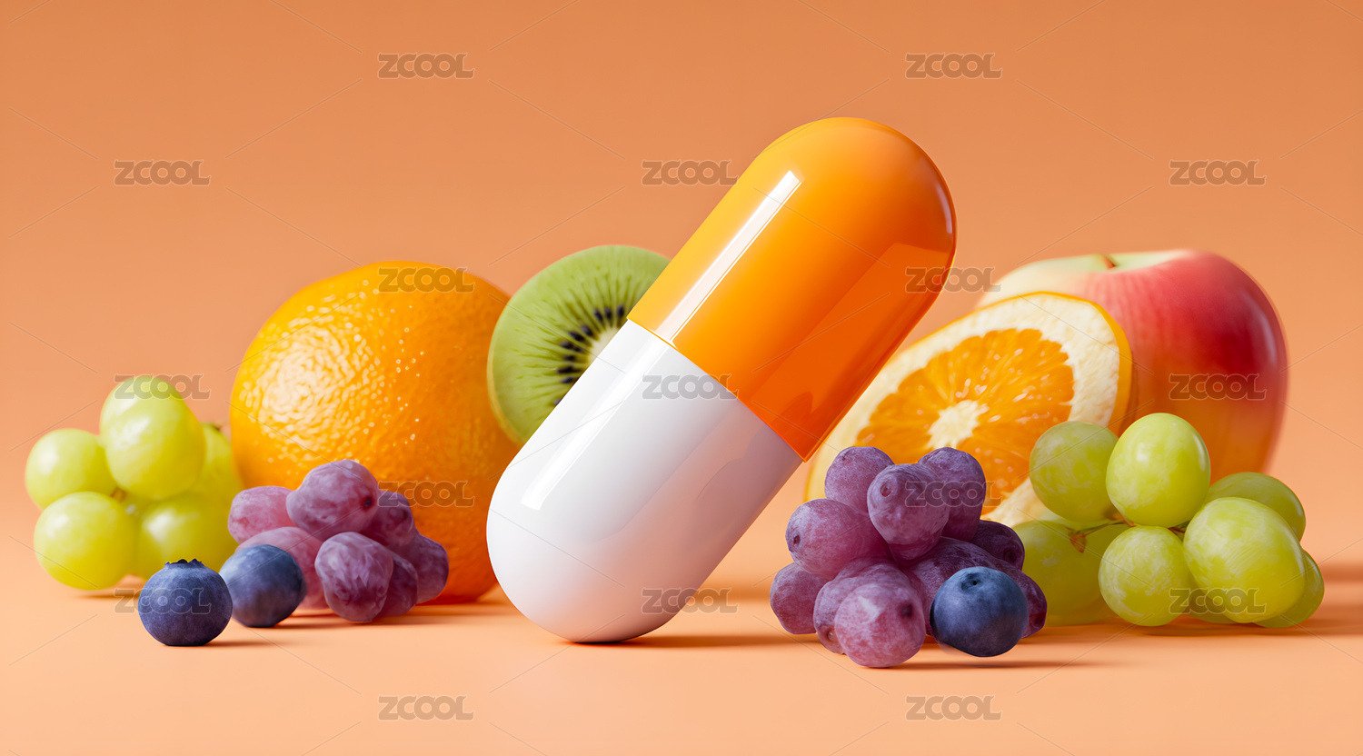 一颗维生素胶囊在水果中间
