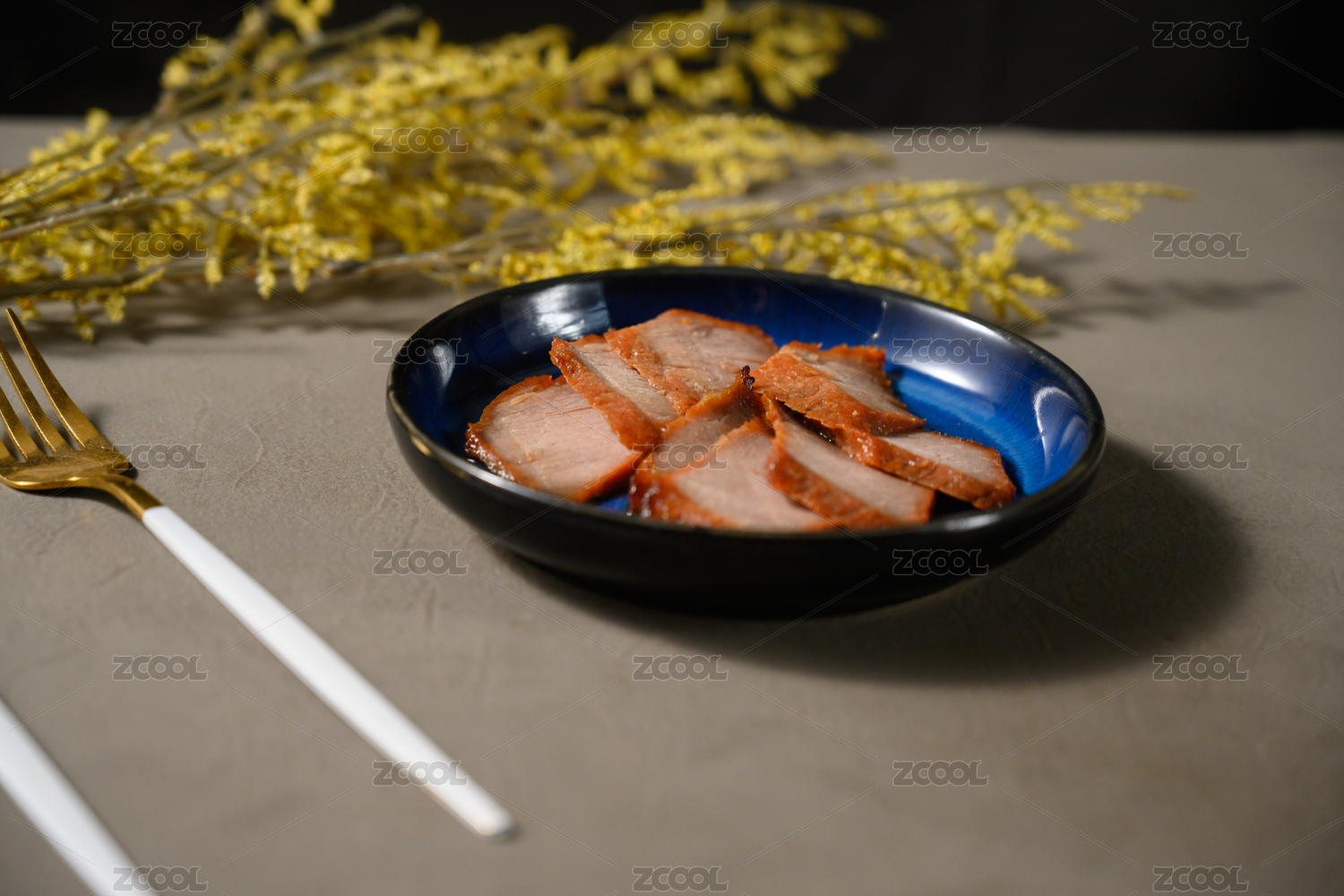 桌面上的盘子里的美味可口的叉烧