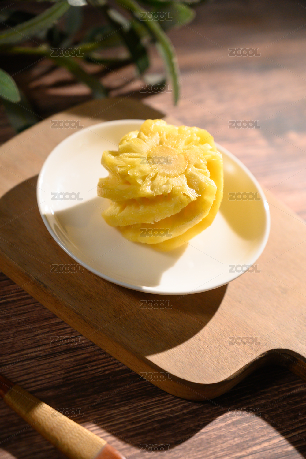 桌面上的盘子里的美味可口的新鲜菠萝