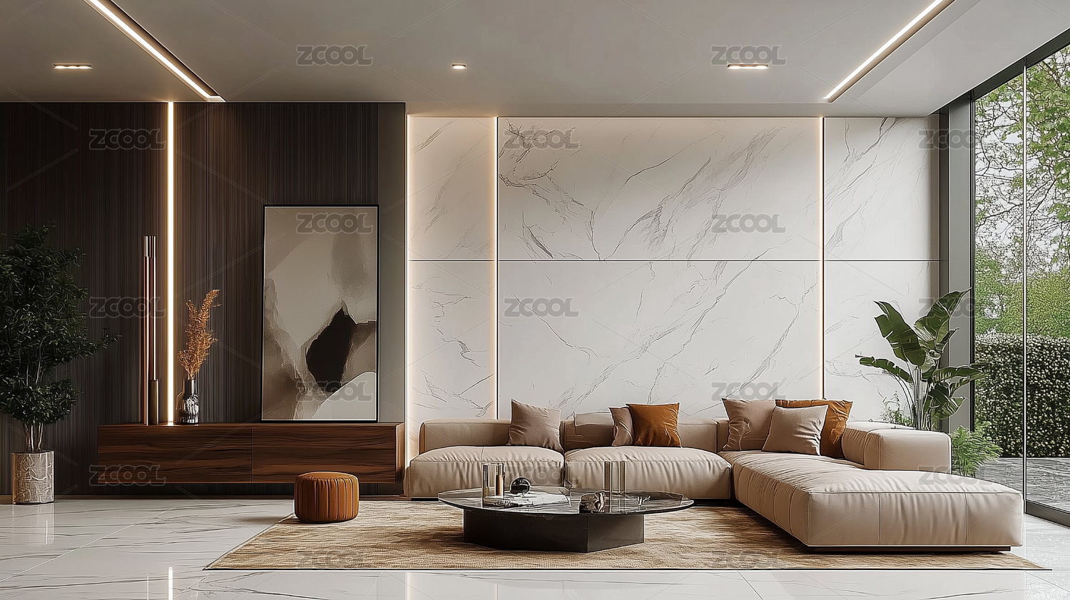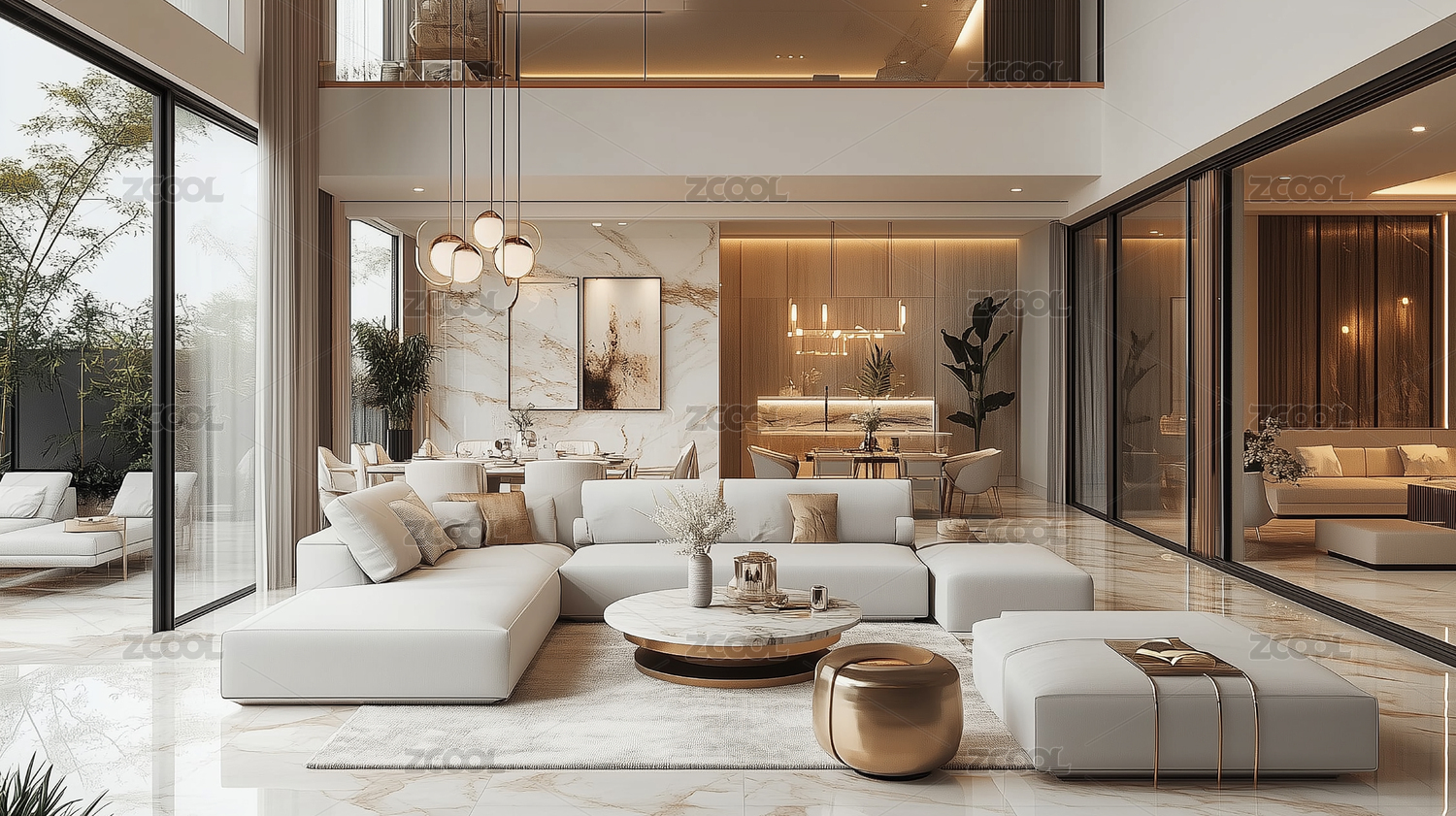 客厅,灰色沙发,金色吊灯,大理石地面,绿植,书架,落地窗户,家居装饰