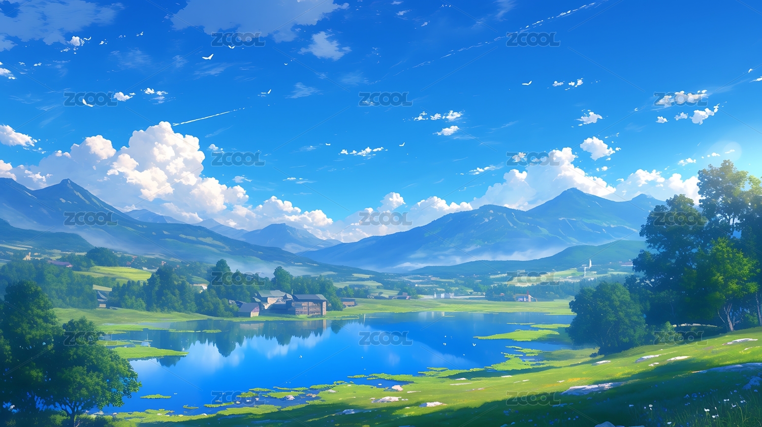 蓝天白云草地湖泊户外场景壁纸