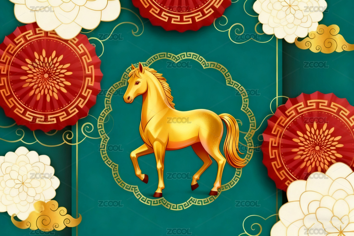 金色骏马与传统花卉图案