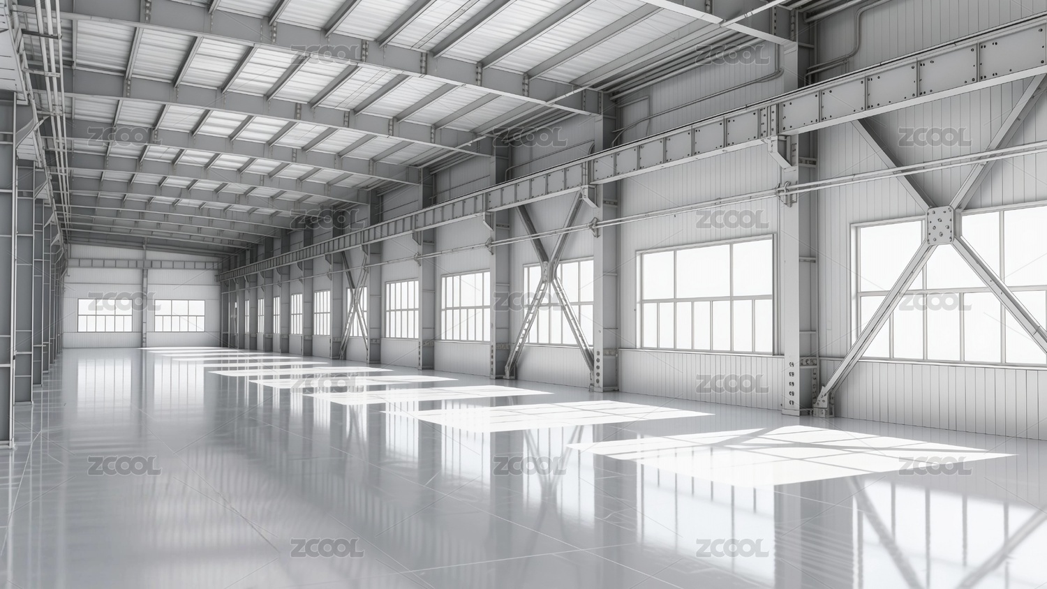 阳光下现代宽敞明亮的工厂仓库室内空间