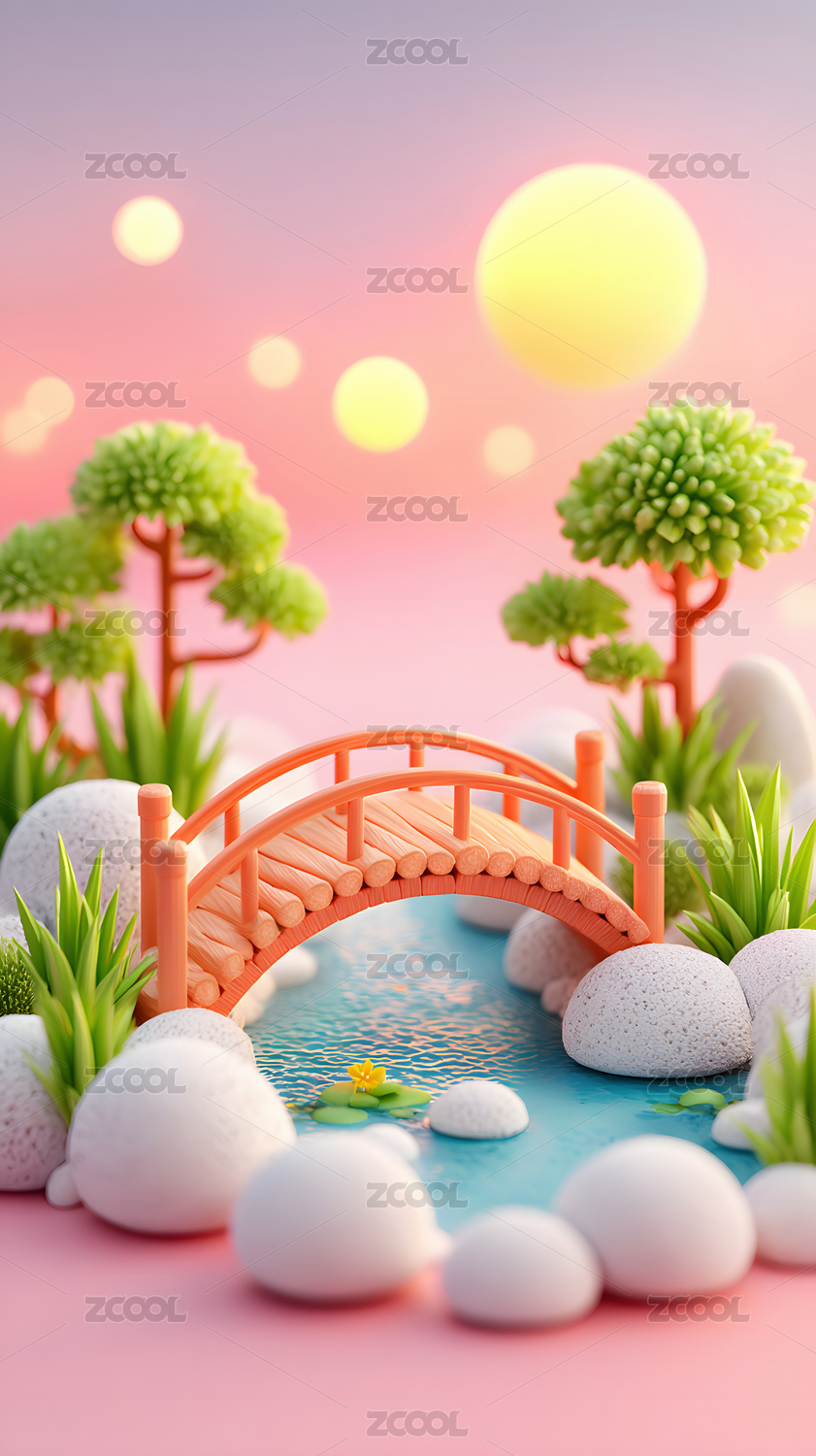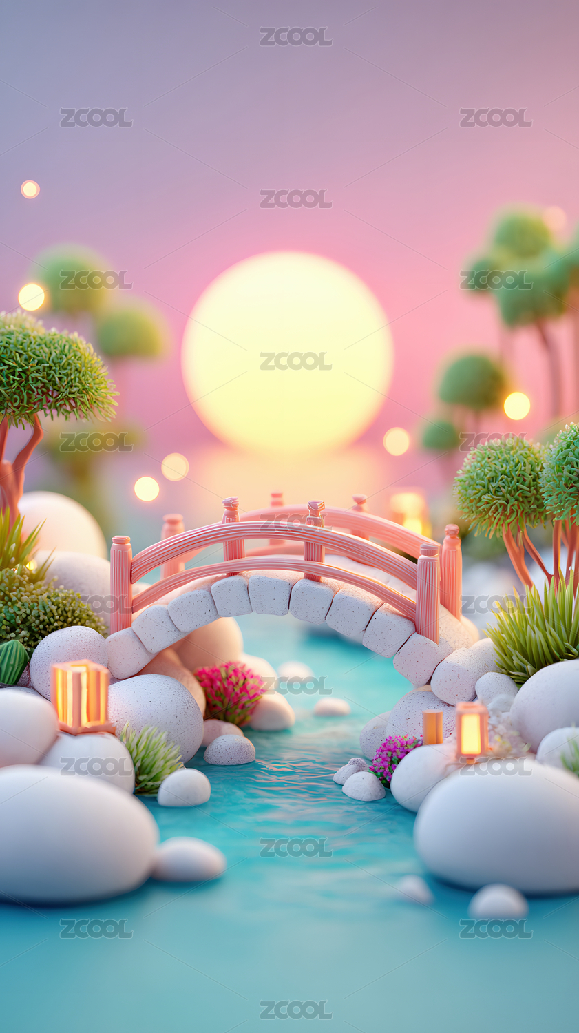 3d卡通圆月小桥流水