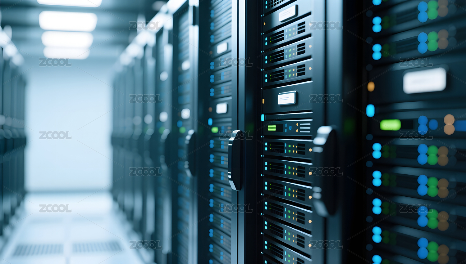 数据中心服务器机柜整齐排列蓝光闪烁