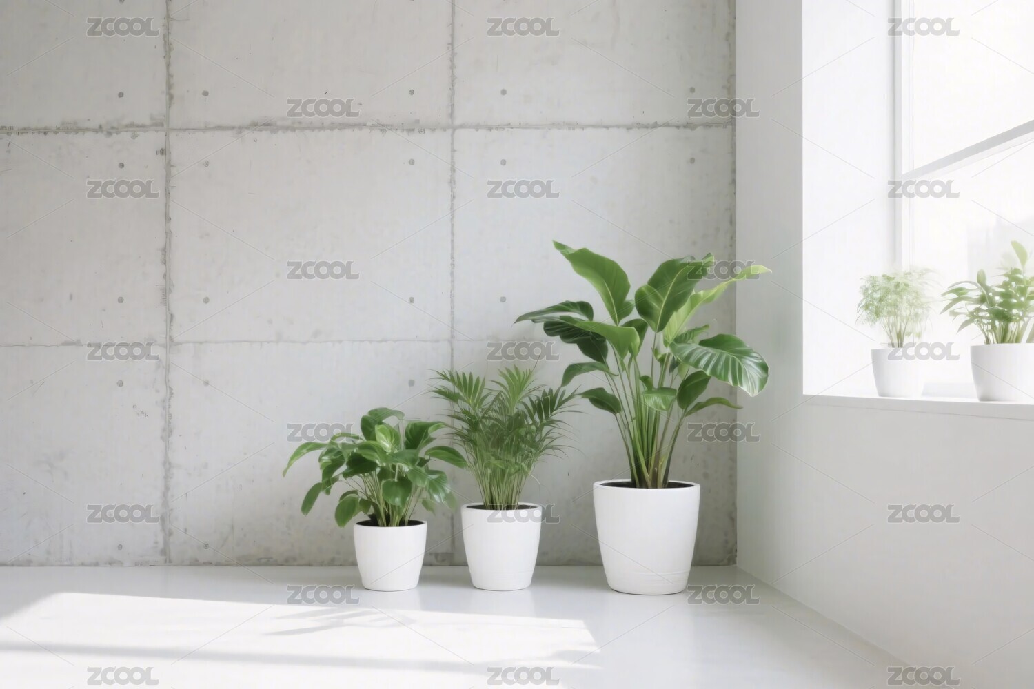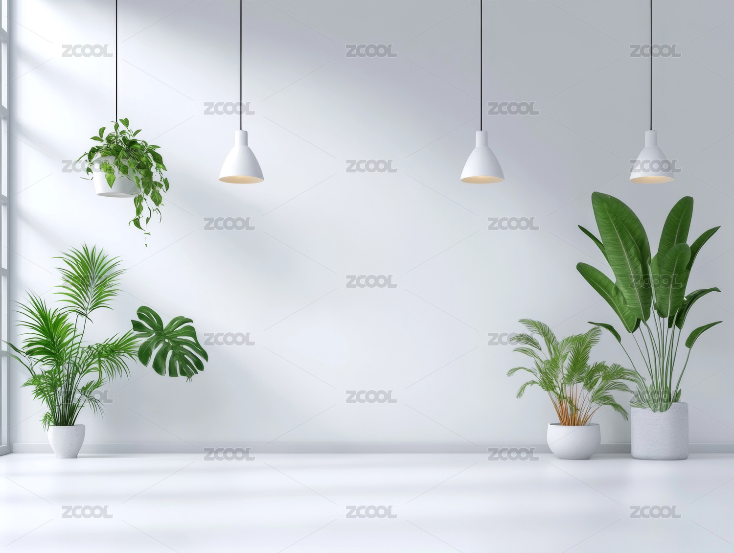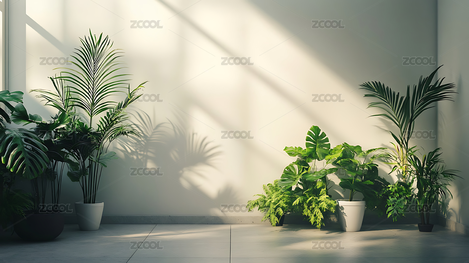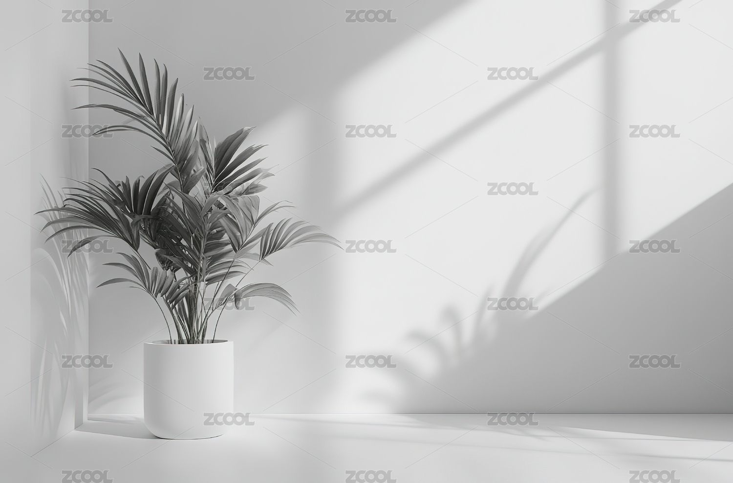 干净的室内白墙和绿植装饰简约空白渲染背景