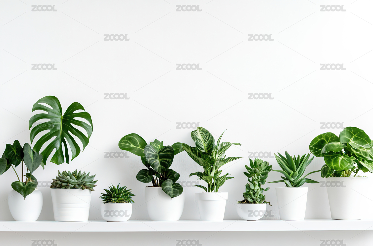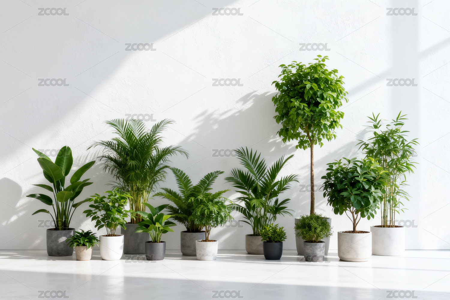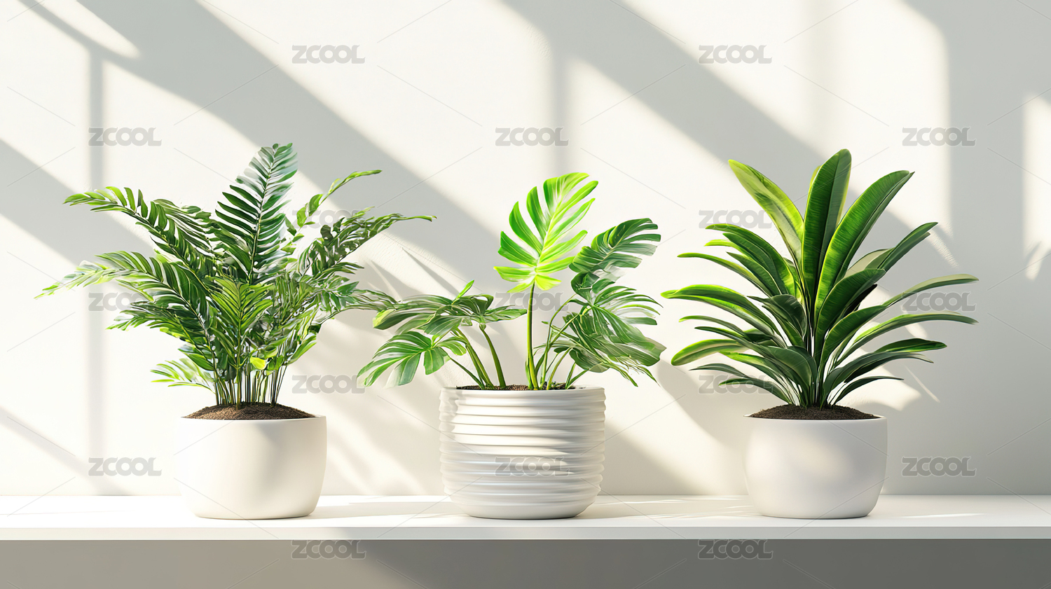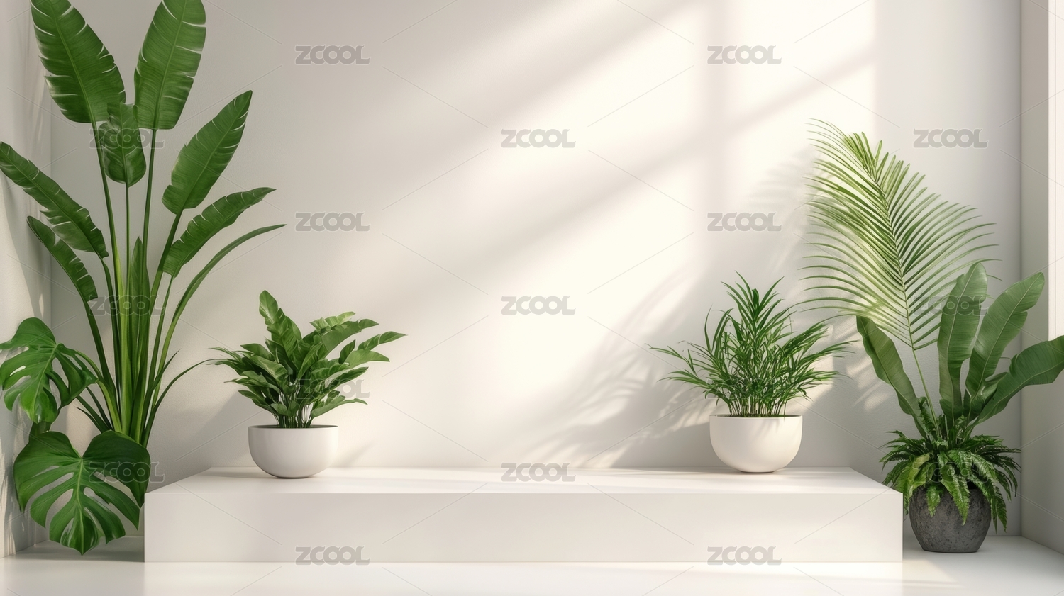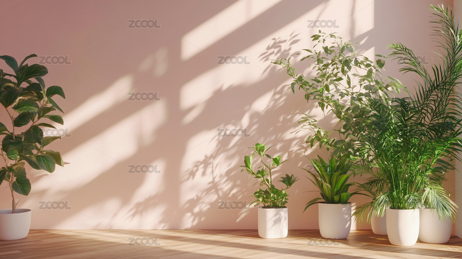 干净的室内白墙和绿植装饰简约空白渲染背景