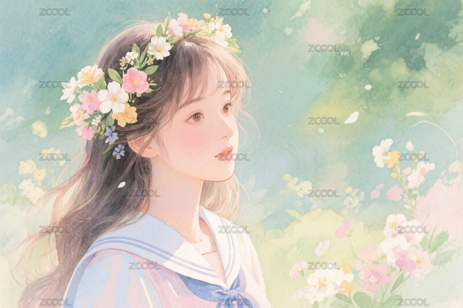 女孩,花环,花朵,校服,插画,模板,清新,自然,少女,动漫