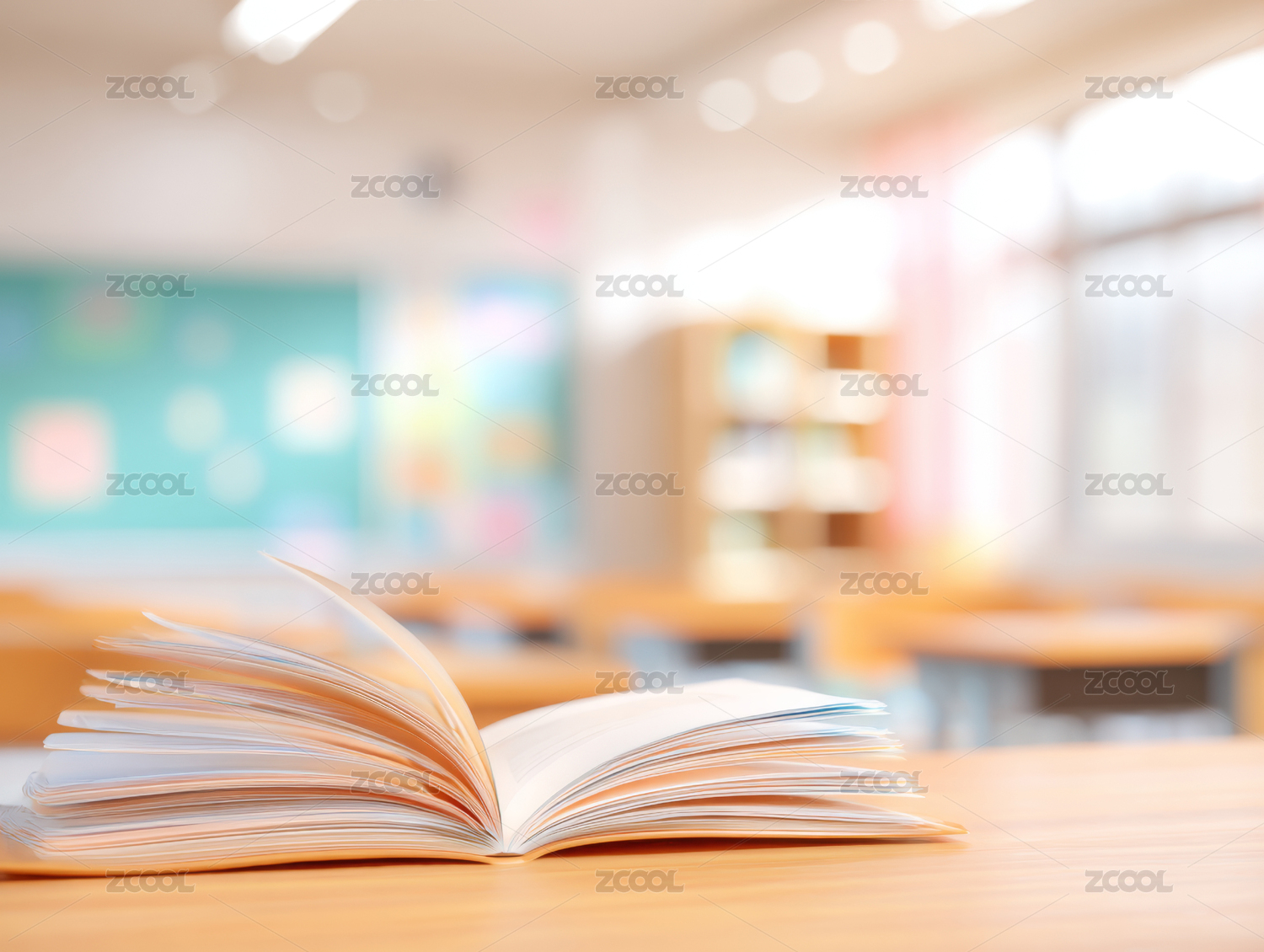 一本打开的书静静地放在明亮蓝色教室的桌子