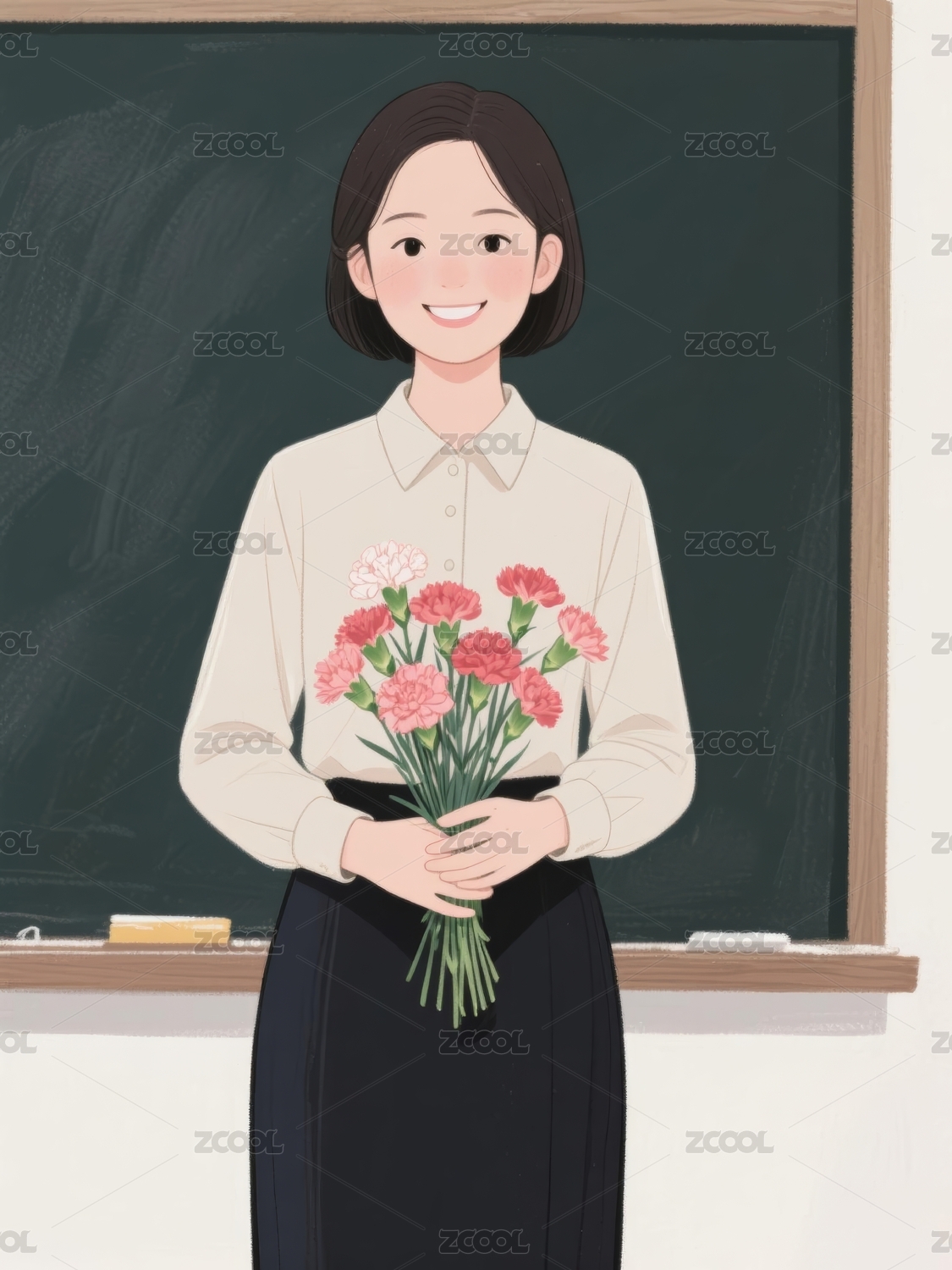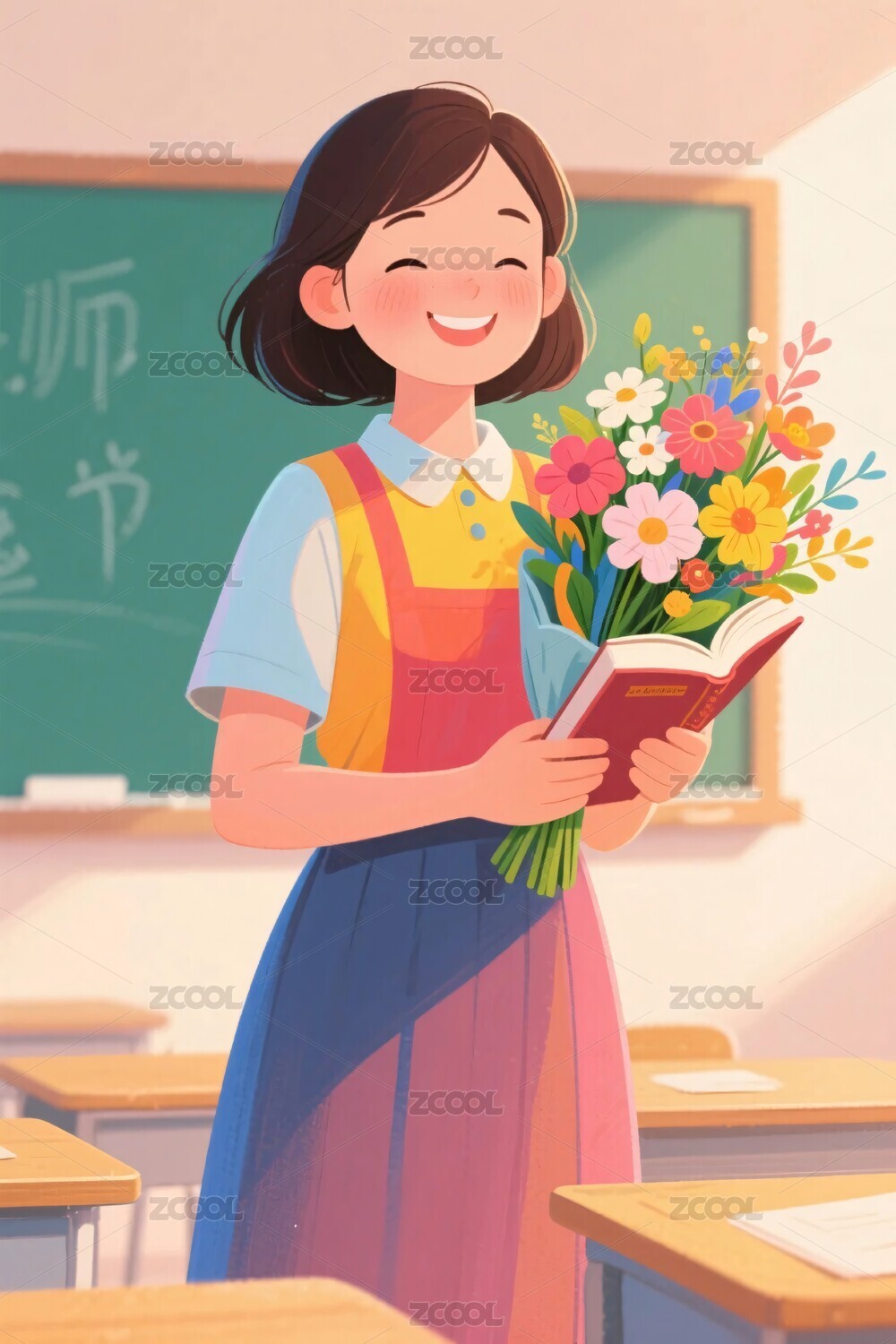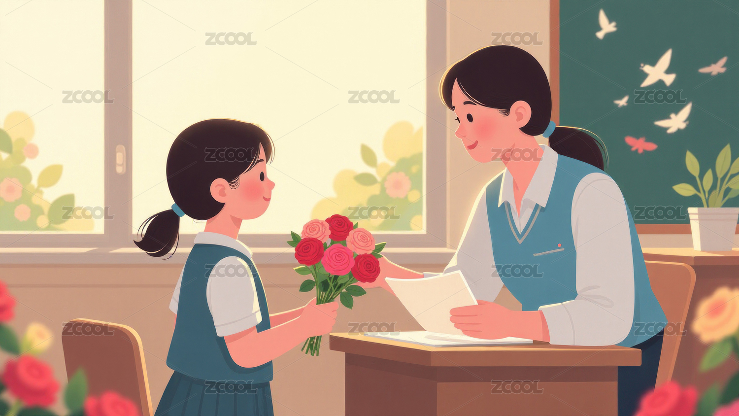 女孩,花束,教室,黑板,红围巾,插画,卡通,校园,贺卡,鲜花