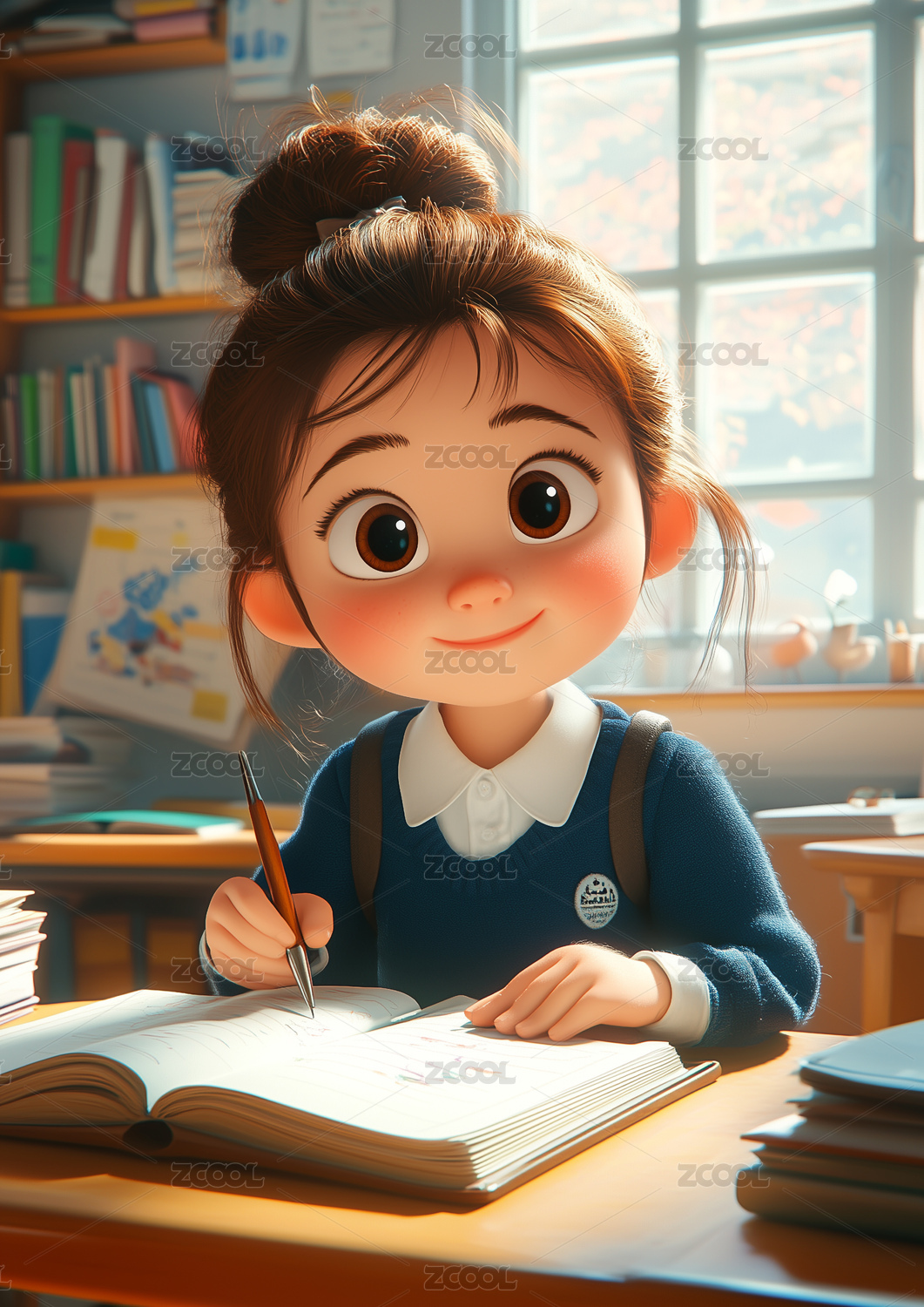 3D卡通风格站在教室里拿着书本微笑的儿童