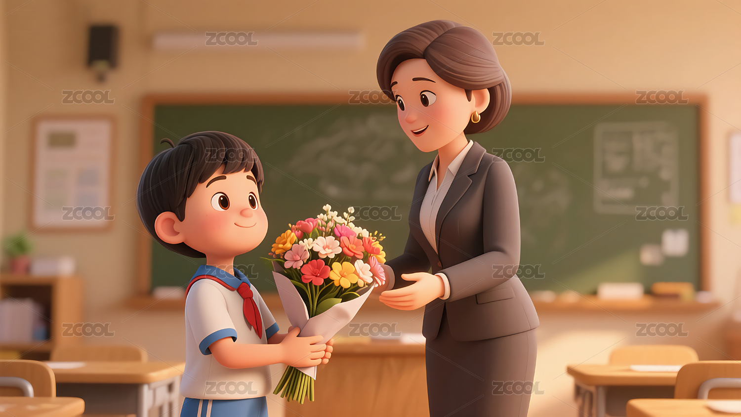 学生们送给老师鲜花3d插画