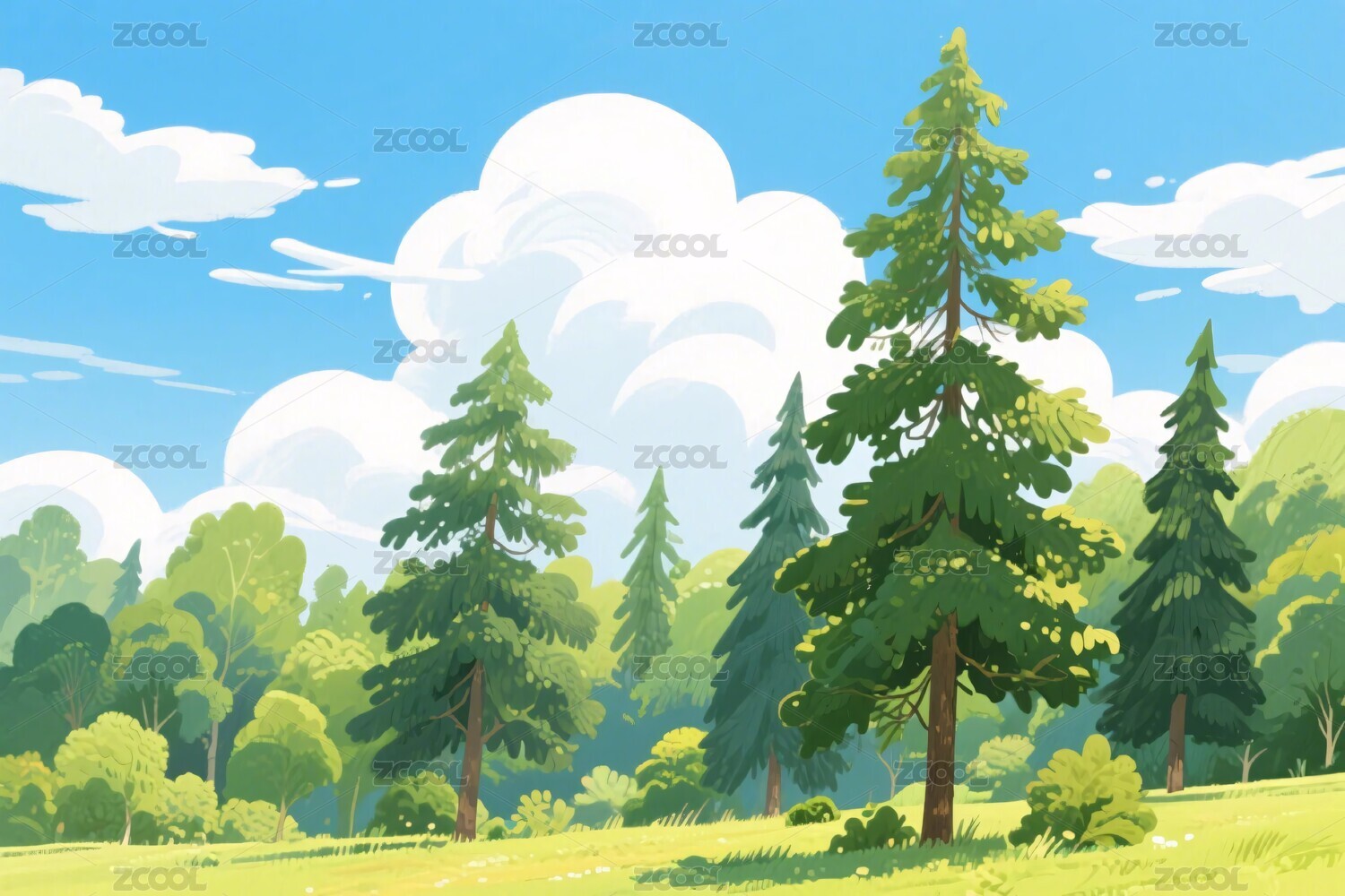 森林,树木,草地,蓝天,白云,风景,自然,宁静,插画,模板