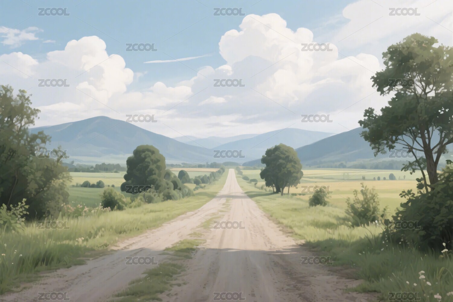森林,小路,道路,绿草,树木,天空,白云,风景,自然,插画